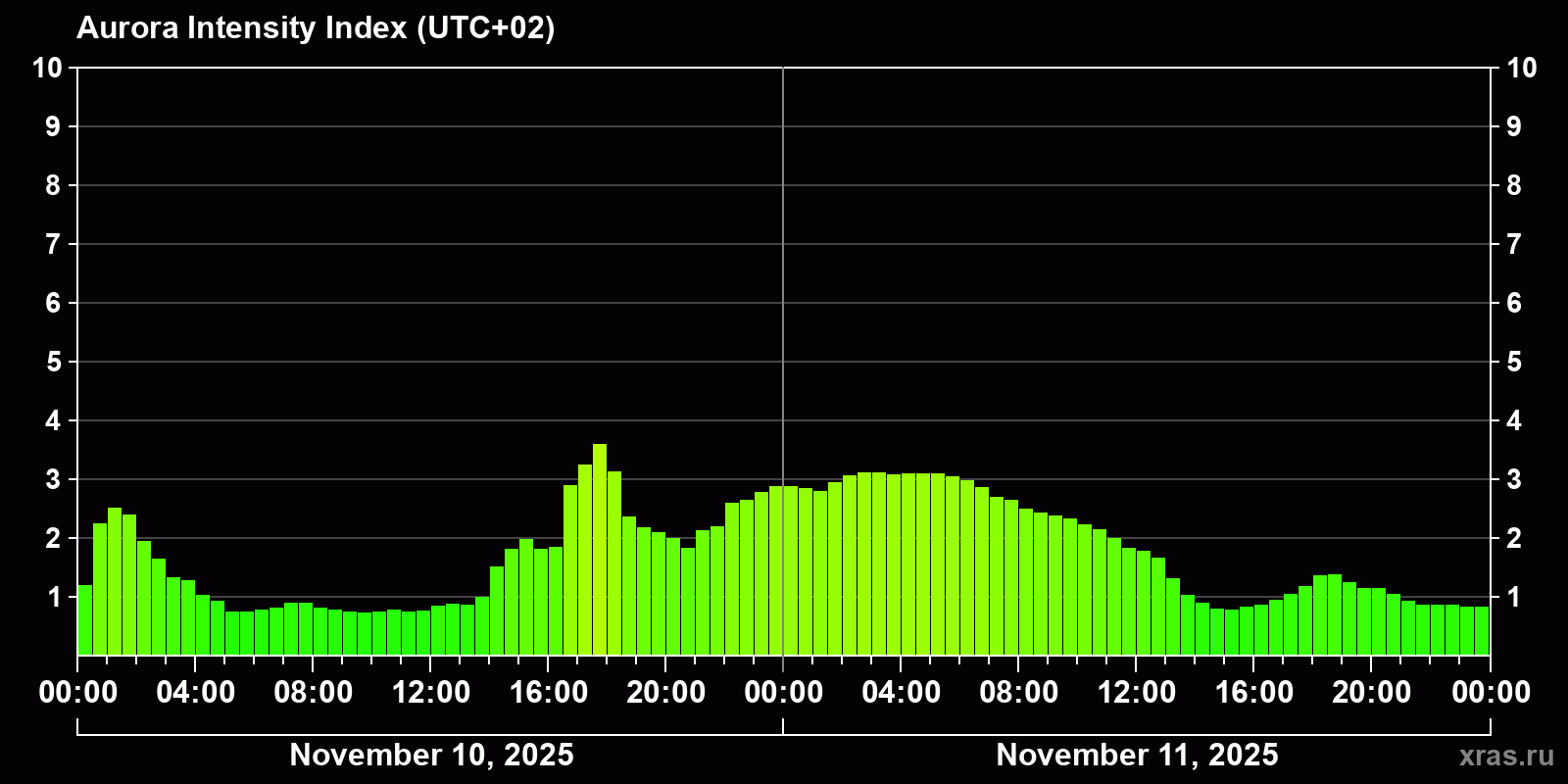 Auroral intensity index and the theoretically possible latitude of observations for nighttime in the Estern Hemisphere as of 2025-11-11 23:45 (end of day) local time