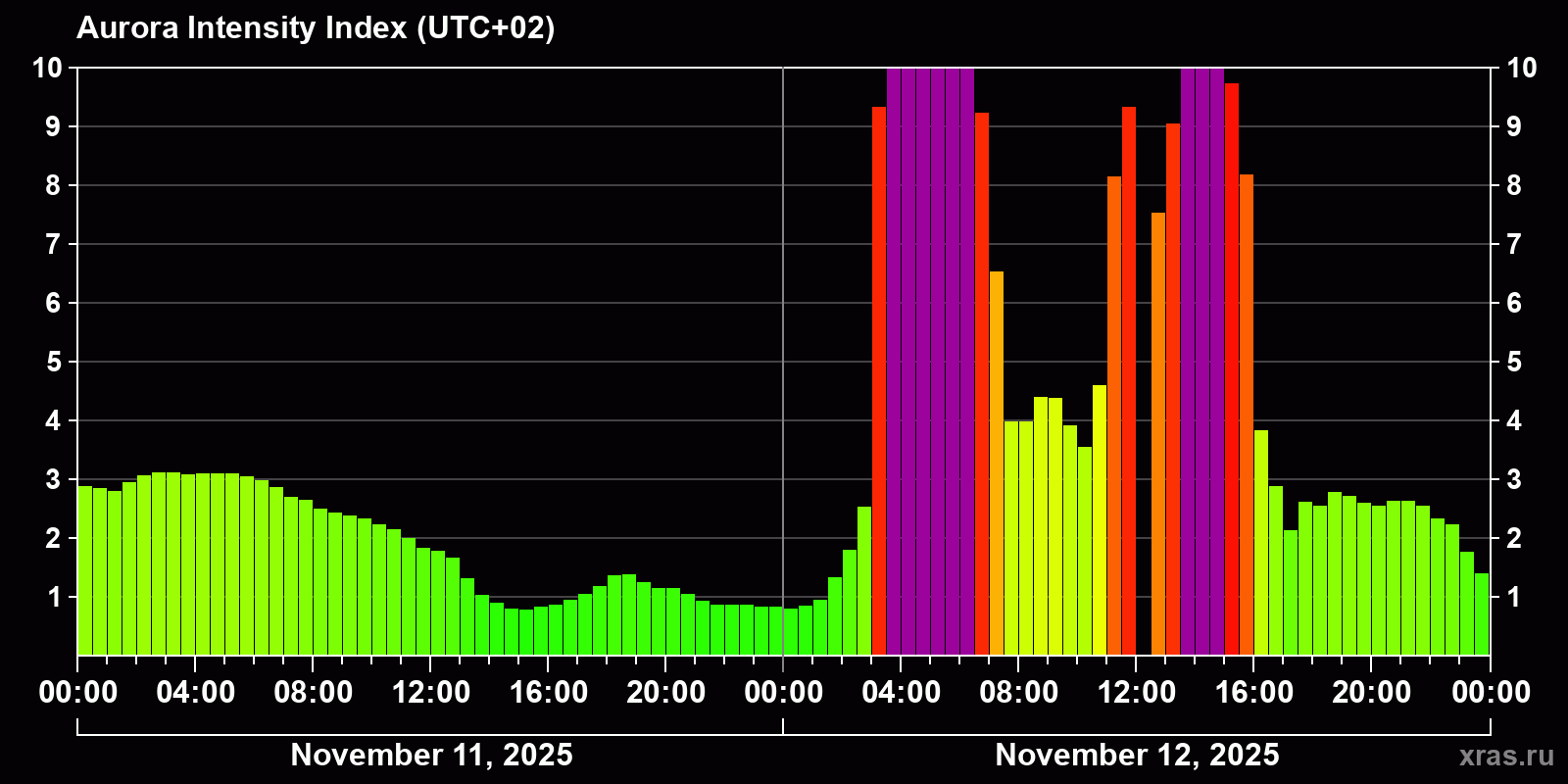 Changes in the auroral intensity index from 2025-11-11 to 2025-11-12 local time