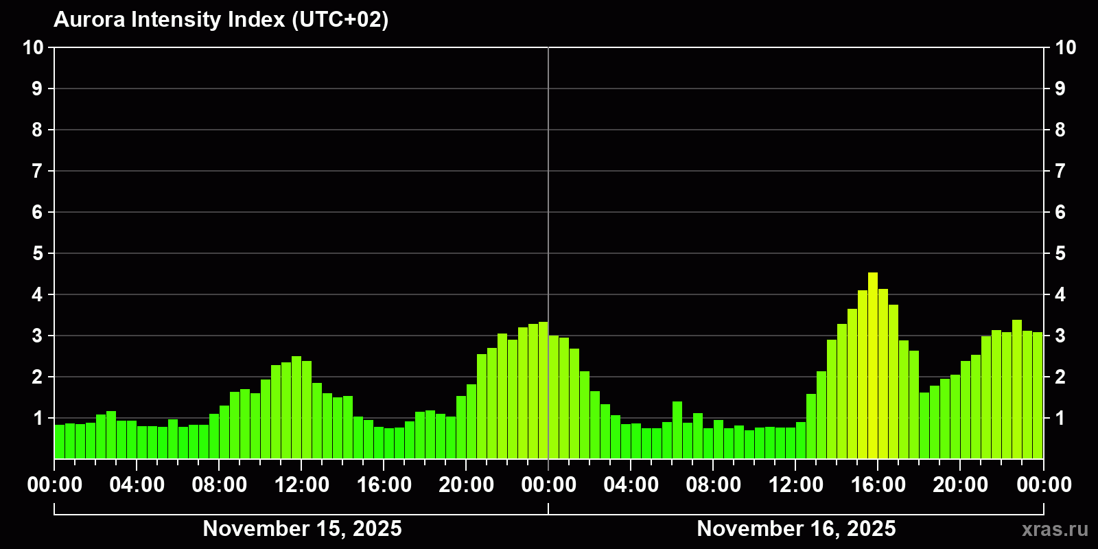 Auroral intensity index and the theoretically possible latitude of observations for nighttime in the Estern Hemisphere as of 2025-11-16 23:57 (end of day) local time