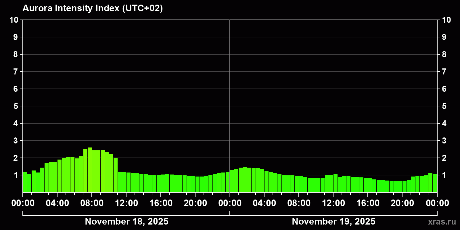 Auroral intensity index and the theoretically possible latitude of observations for nighttime in the Estern Hemisphere as of 2025-11-19 23:44 (end of day) local time
