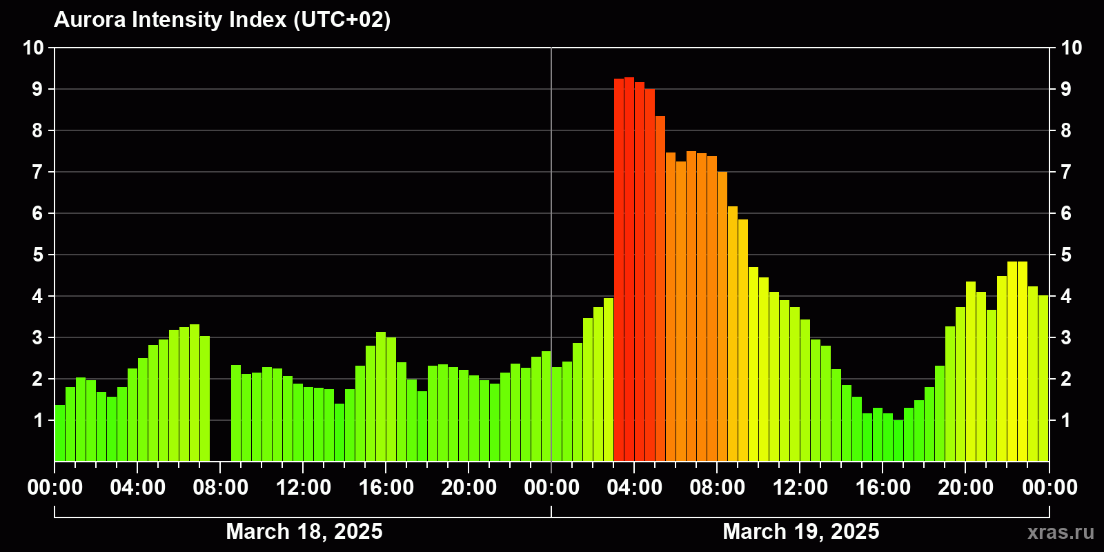 Changes in the auroral intensity index from 2025-03-18 to 2025-03-19 local time
