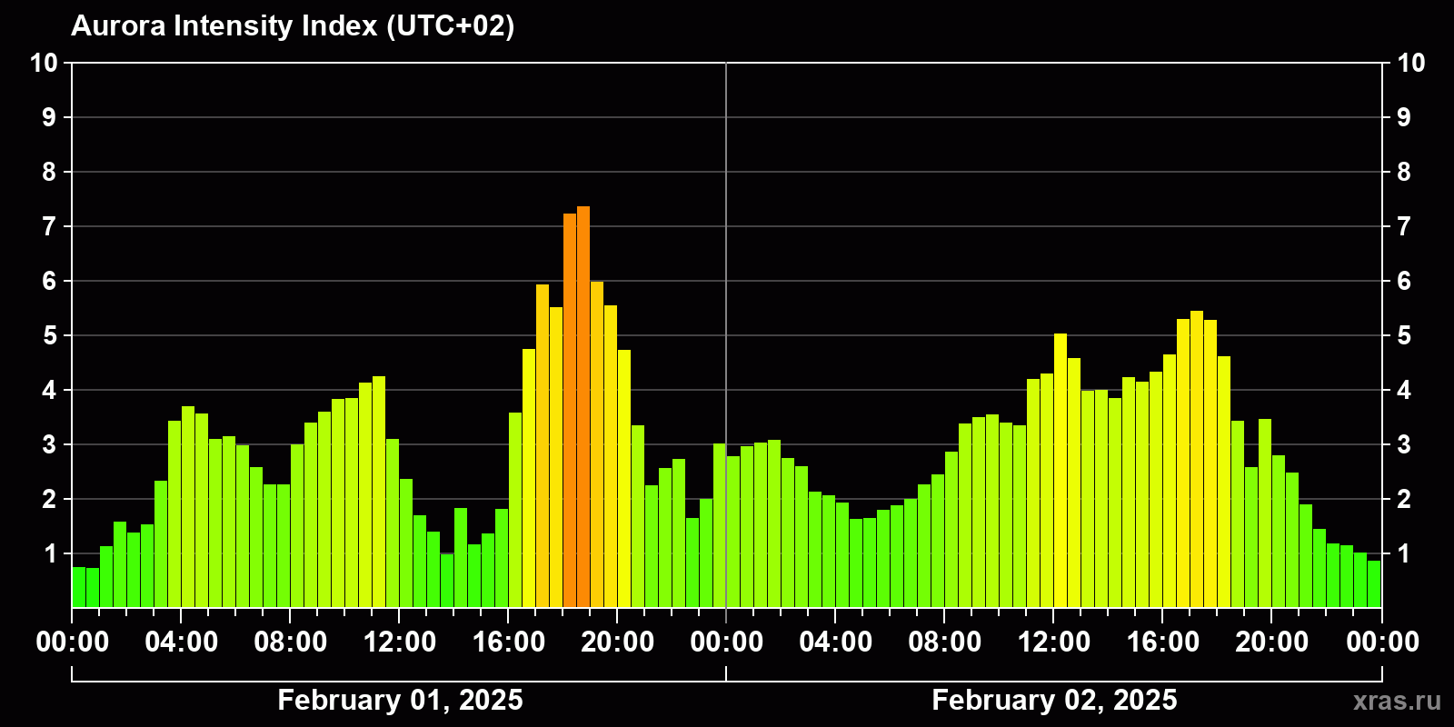 Auroral intensity index and the theoretically possible latitude of observations for nighttime in the Estern Hemisphere as of 2025-02-02 23:41 (end of day) local time