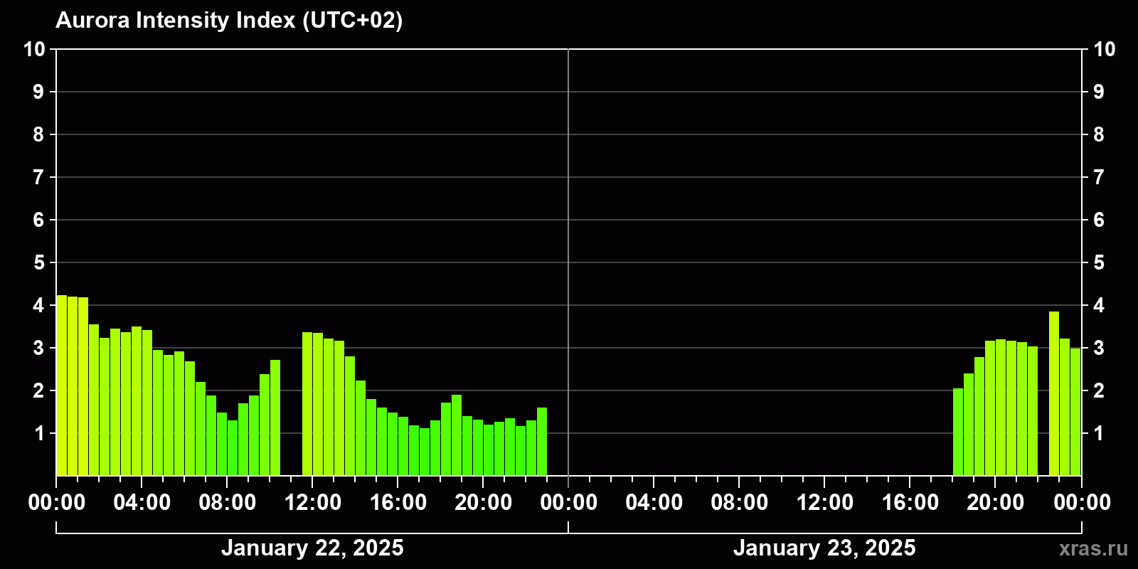 Auroral intensity index and the theoretically possible latitude of observations for nighttime in the Estern Hemisphere as of 2025-01-23 23:50 (end of day) local time