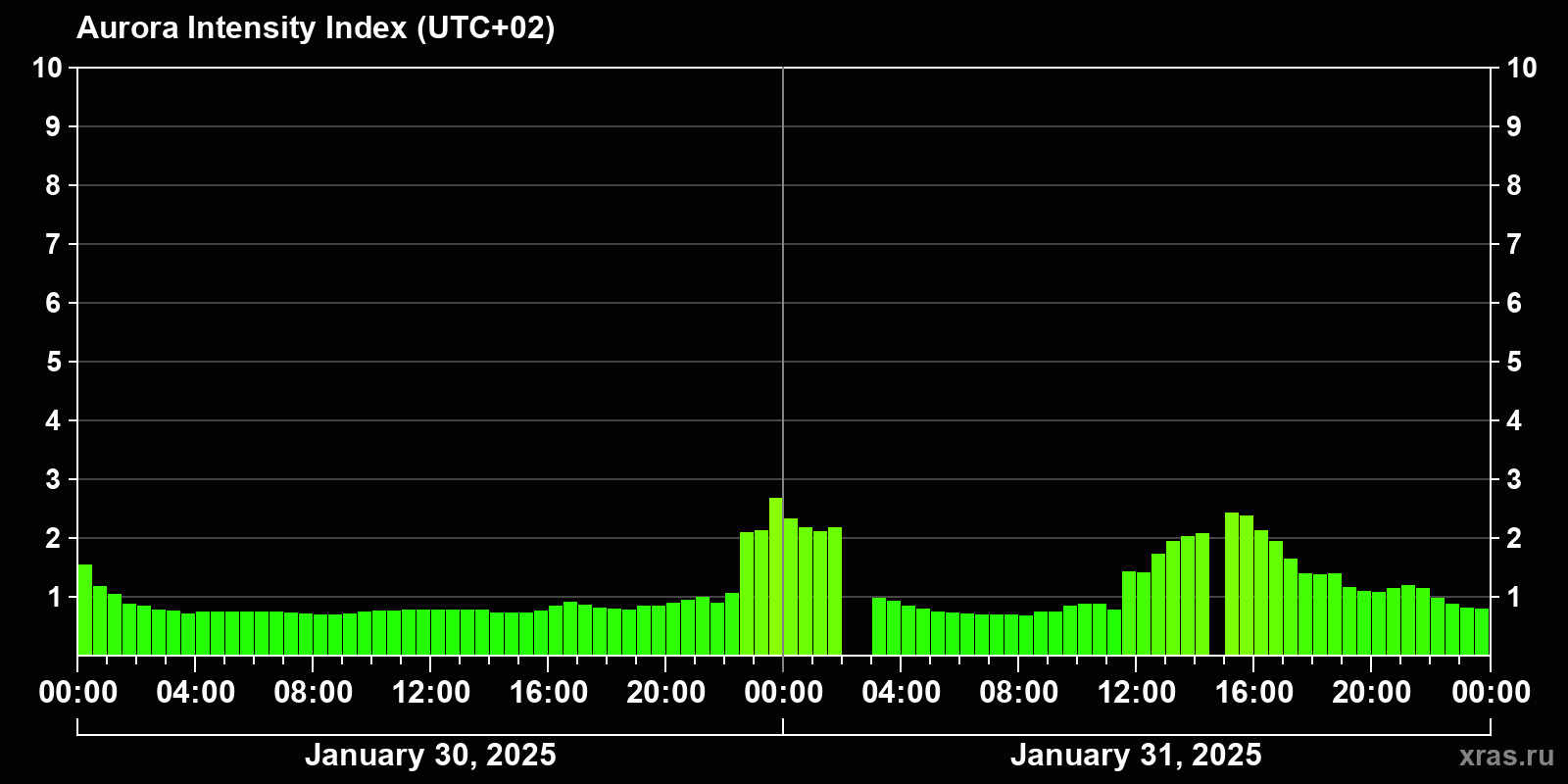 Auroral intensity index and the theoretically possible latitude of observations for nighttime in the Estern Hemisphere as of 2025-01-31 23:56 (end of day) local time