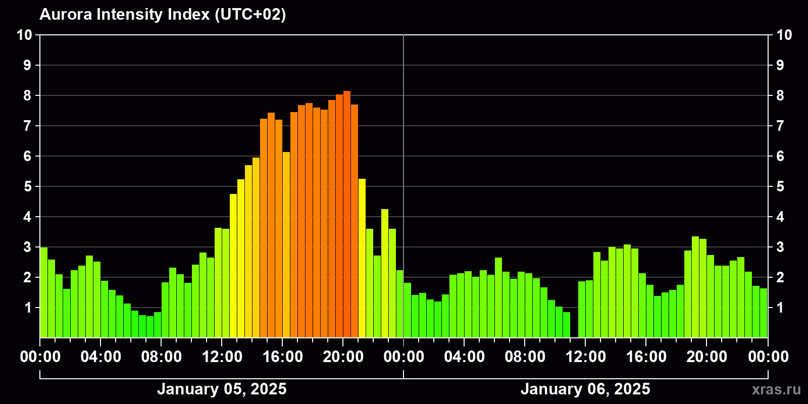 Changes in the auroral intensity index from 2025-01-05 to 2025-01-06 local time