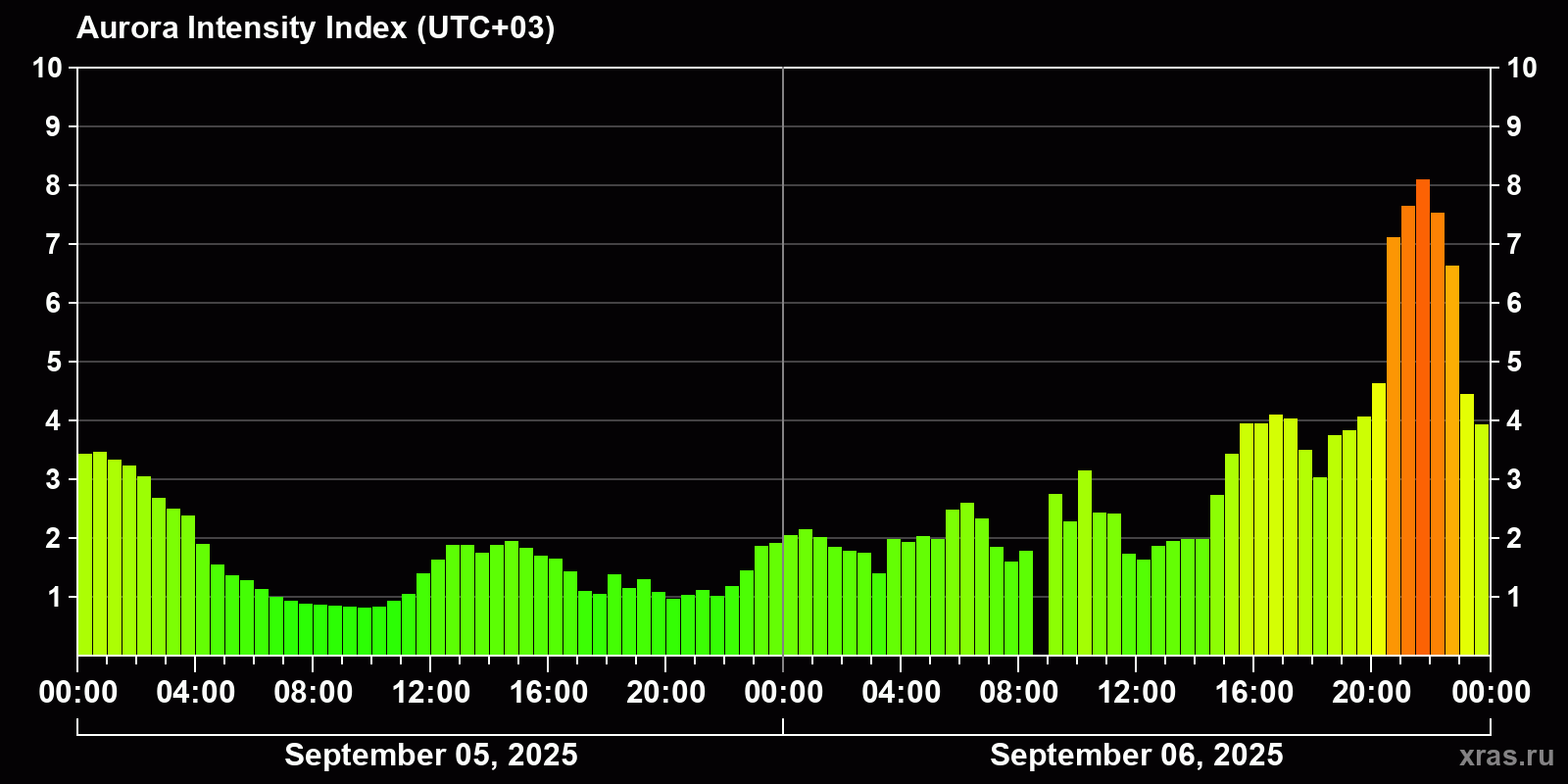 Auroral intensity index and the theoretically possible latitude of observations for nighttime in the Estern Hemisphere as of 2025-09-06 23:58 (end of day) local time