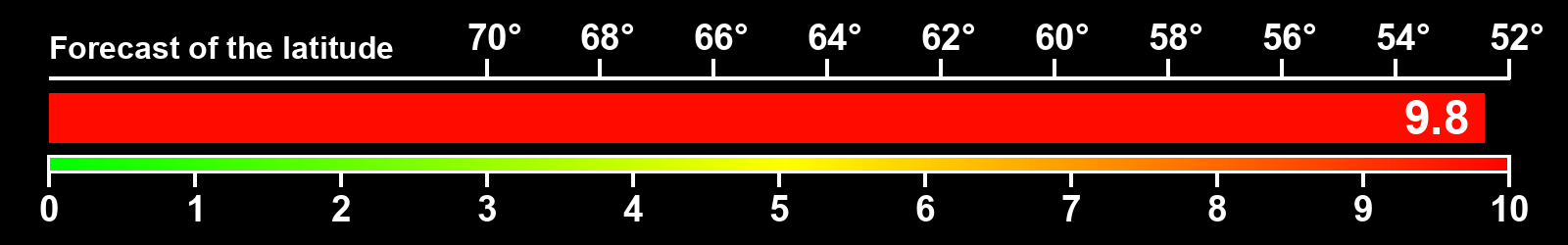 Auroral intensity index and the theoretically possible latitude of observations for nighttime in the Estern Hemisphere as of 2025-03-08 23:49 (end of day) local time