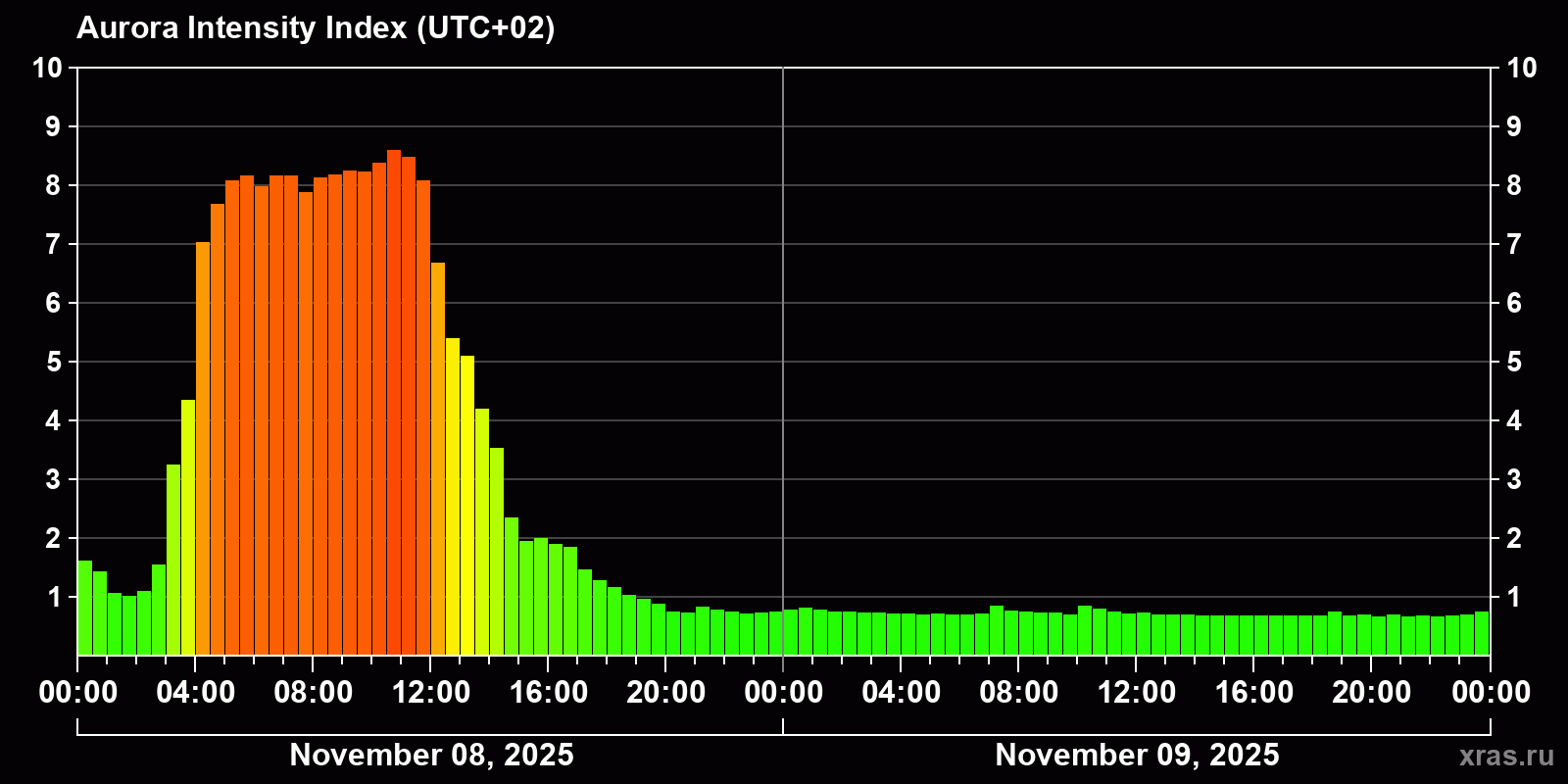 Changes in the auroral intensity index from 2025-11-08 to 2025-11-09 local time