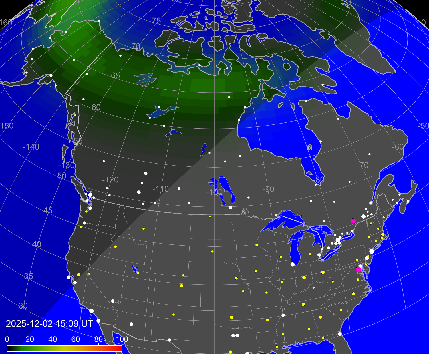 Вероятность полярных сияний в городах США