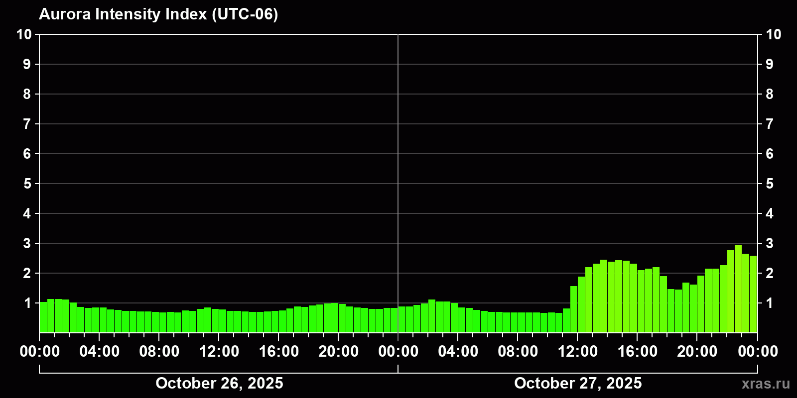Changes in the auroral intensity index from 2025-10-26 to 2025-10-27 local time