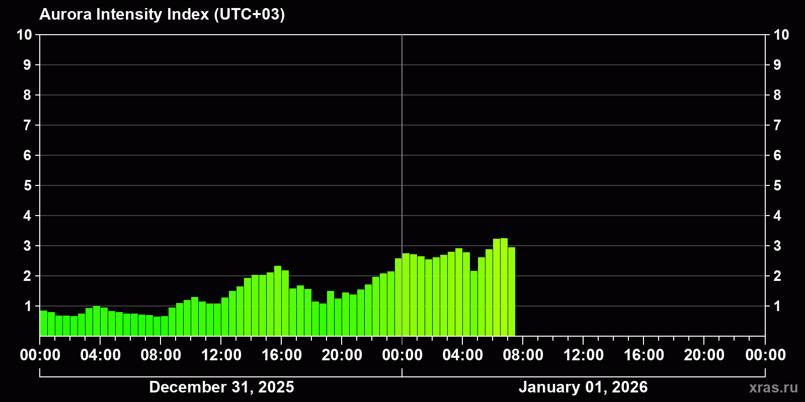 Auroral intensity index and the theoretically possible latitude of observations for nighttime in the Estern Hemisphere as of 2026-01-01 04:15 (end of day) local time