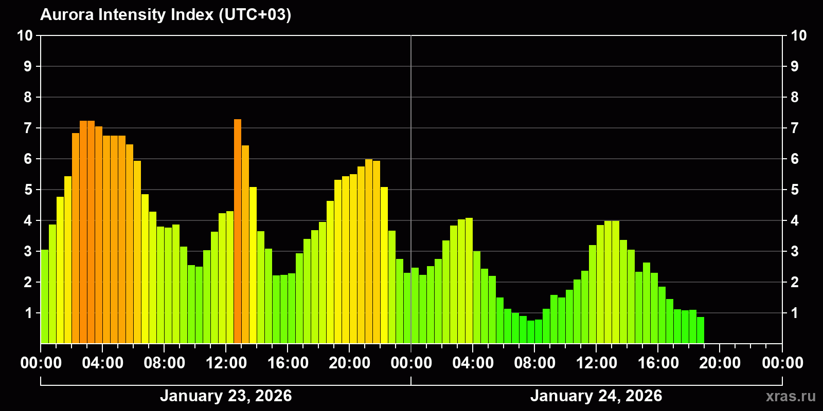 Auroral intensity index and the theoretically possible latitude of observations for nighttime in the Estern Hemisphere as of 2026-01-24 15:15 (end of day) local time