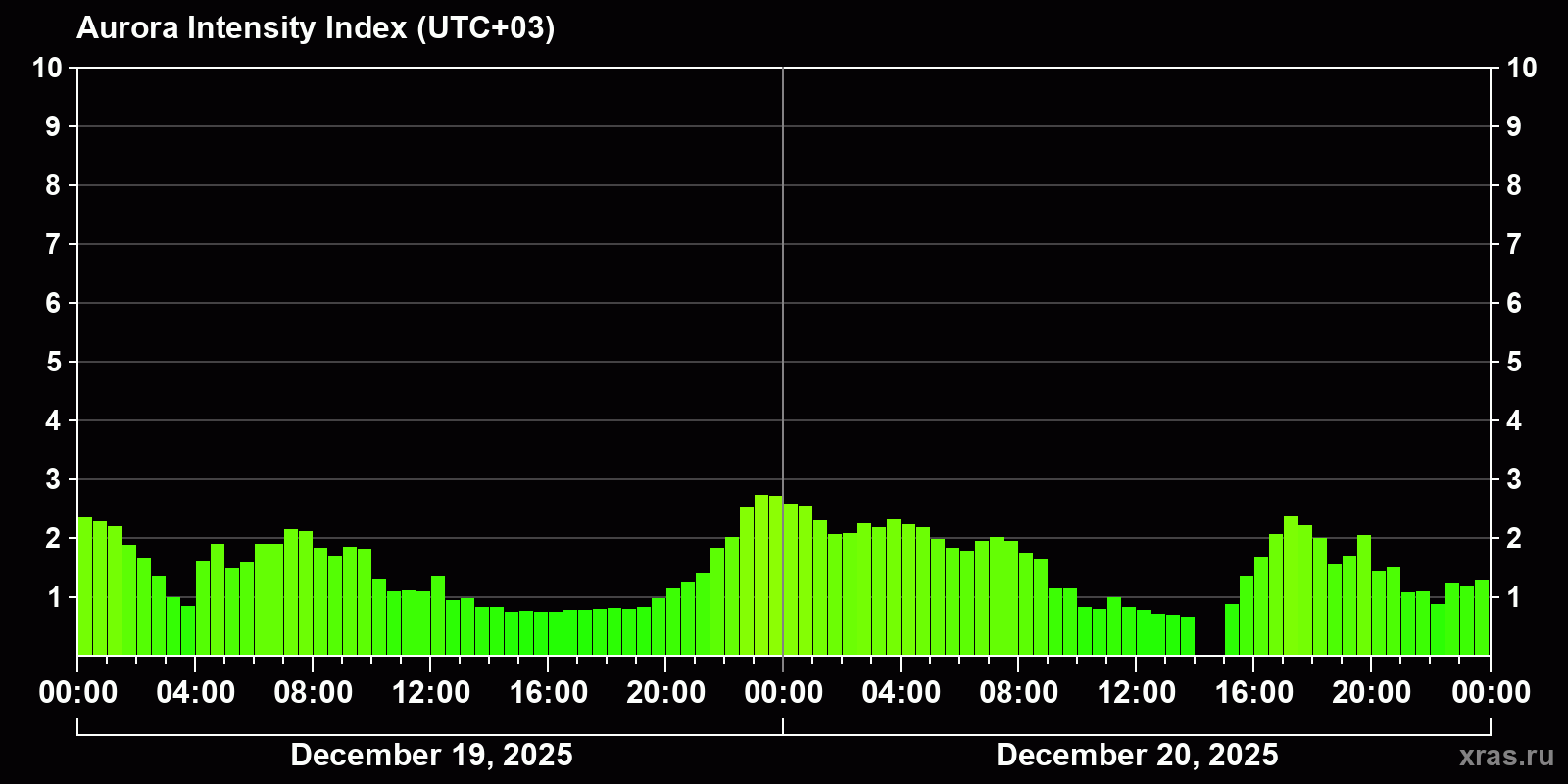 Auroral intensity index and the theoretically possible latitude of observations for nighttime in the Estern Hemisphere as of 2025-12-20 23:56 (end of day) local time