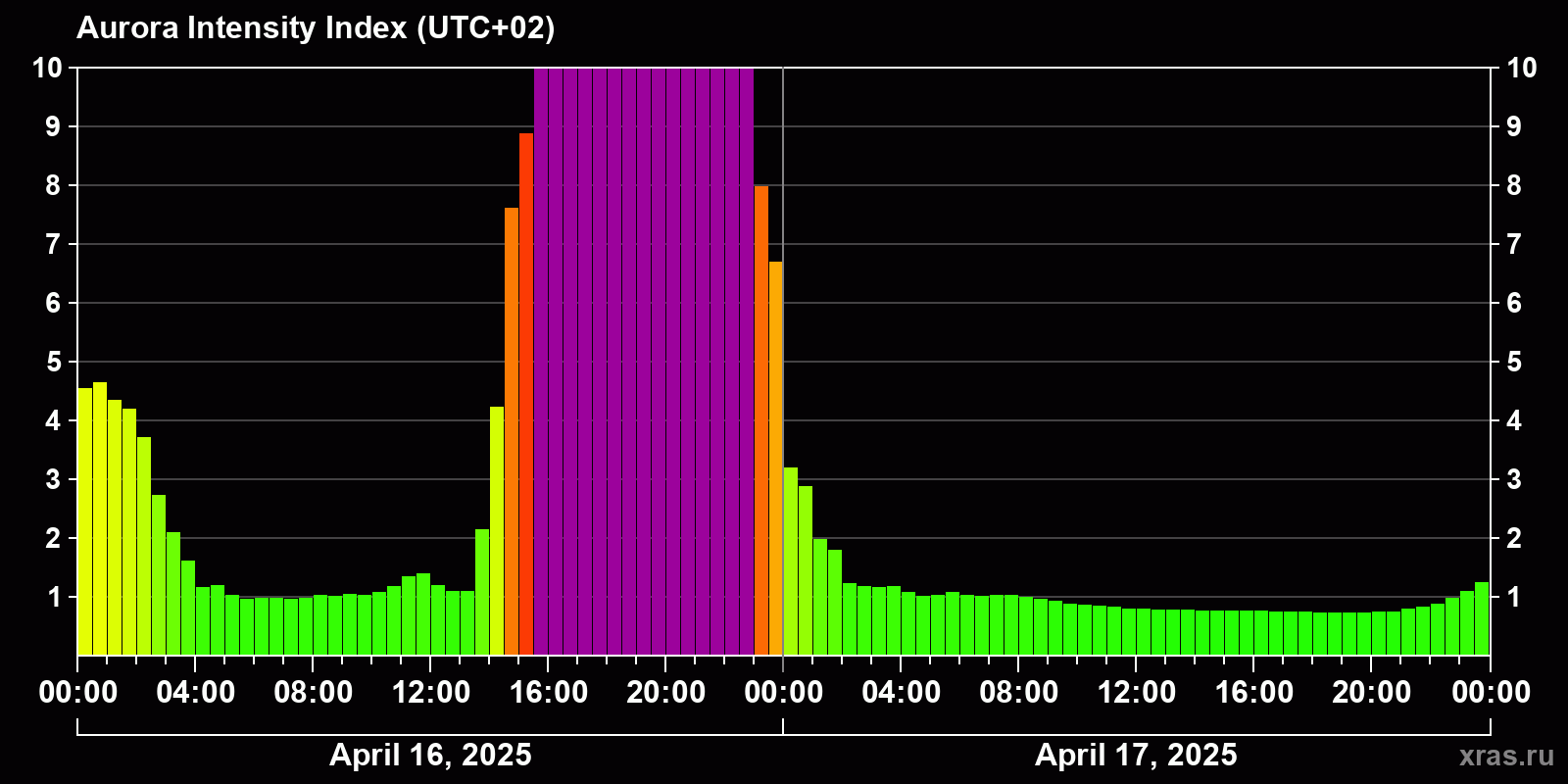 Changes in the auroral intensity index from 2025-04-16 to 2025-04-17 local time