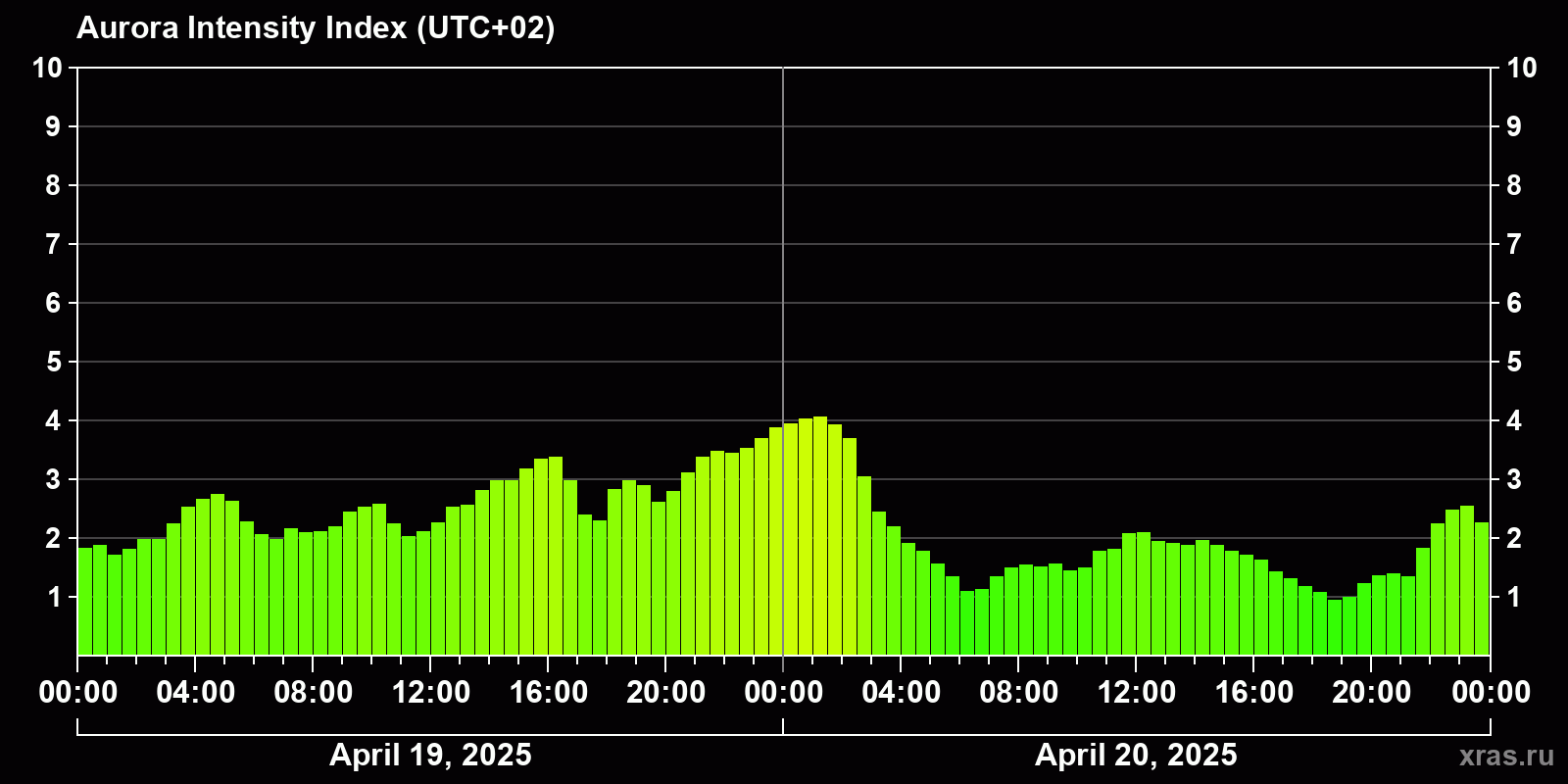 Changes in the auroral intensity index from 2025-04-19 to 2025-04-20 local time