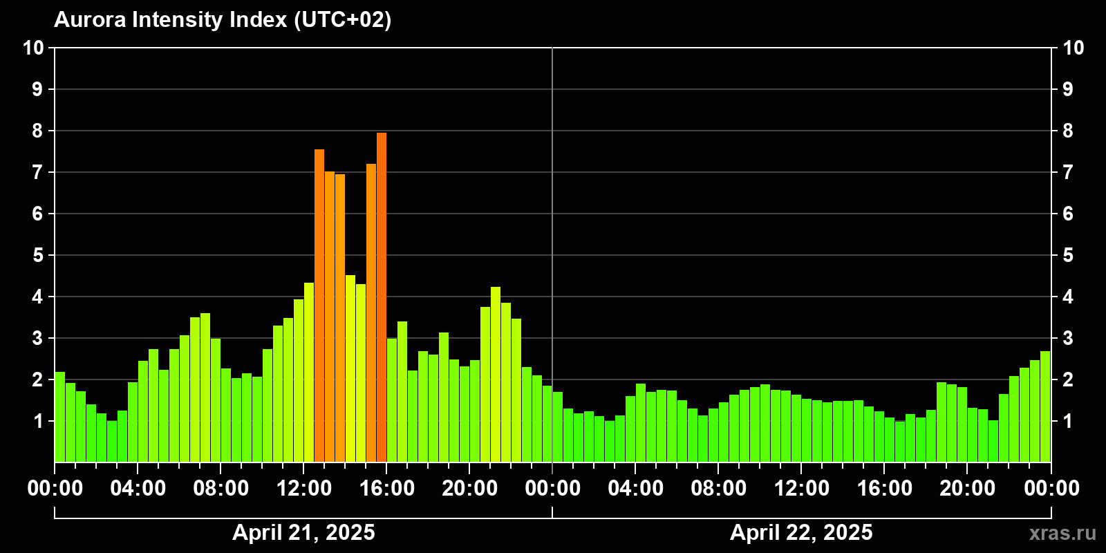 Changes in the auroral intensity index from 2025-04-21 to 2025-04-22 local time