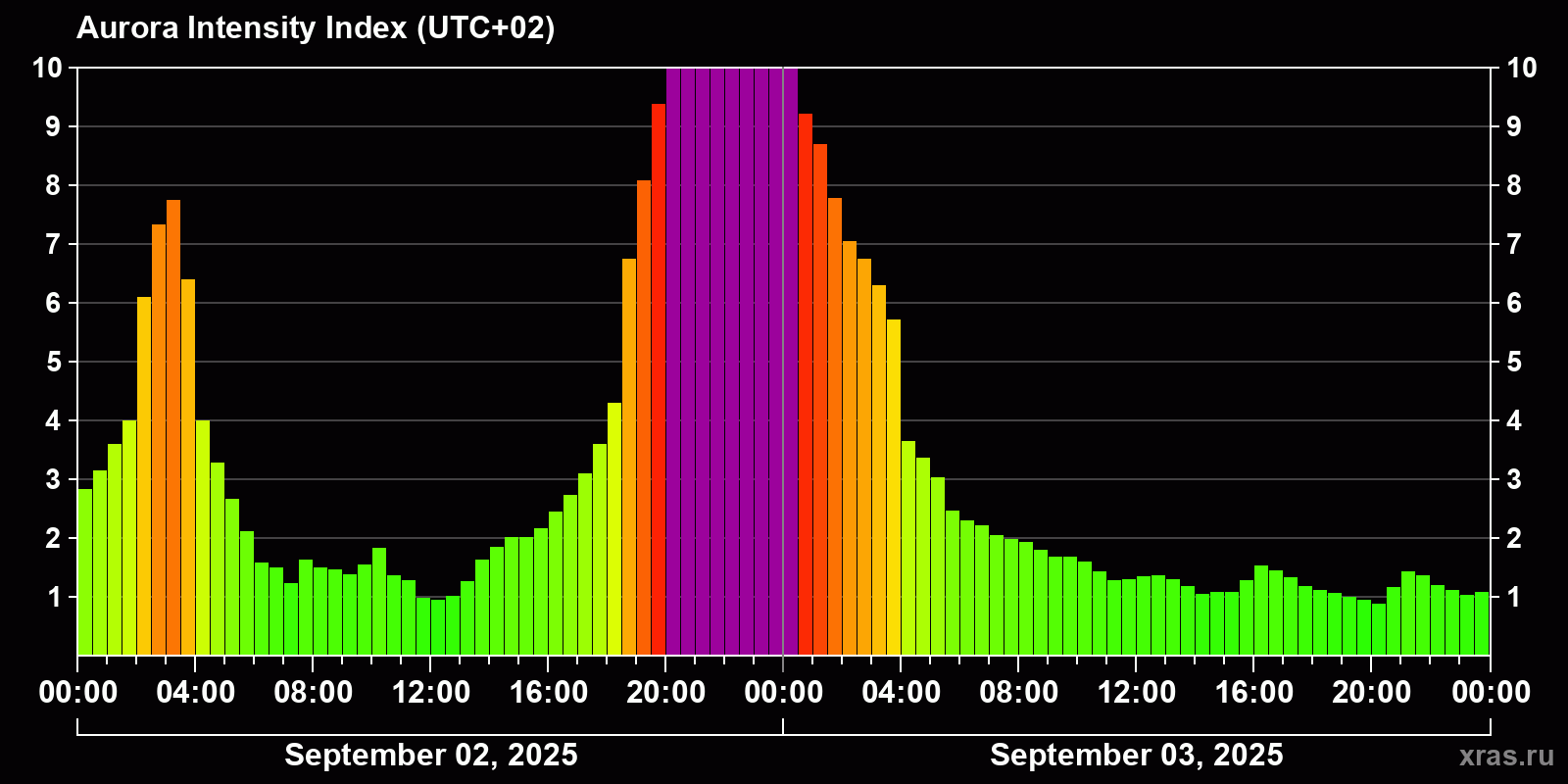 Changes in the auroral intensity index from 2025-09-02 to 2025-09-03 local time