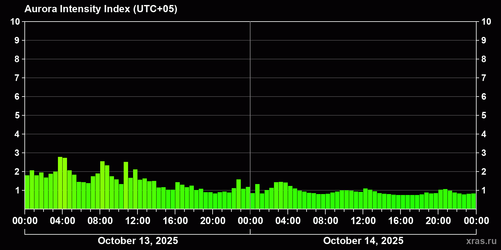 Changes in the auroral intensity index from 2025-10-13 to 2025-10-14 local time