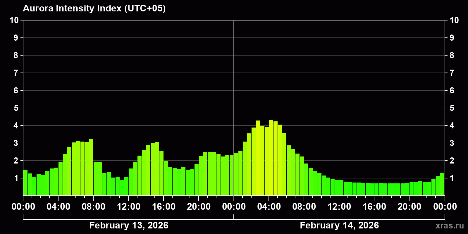 Auroral intensity index and the theoretically possible latitude of observations for nighttime in the Estern Hemisphere as of 2026-02-14 23:55 (end of day) local time