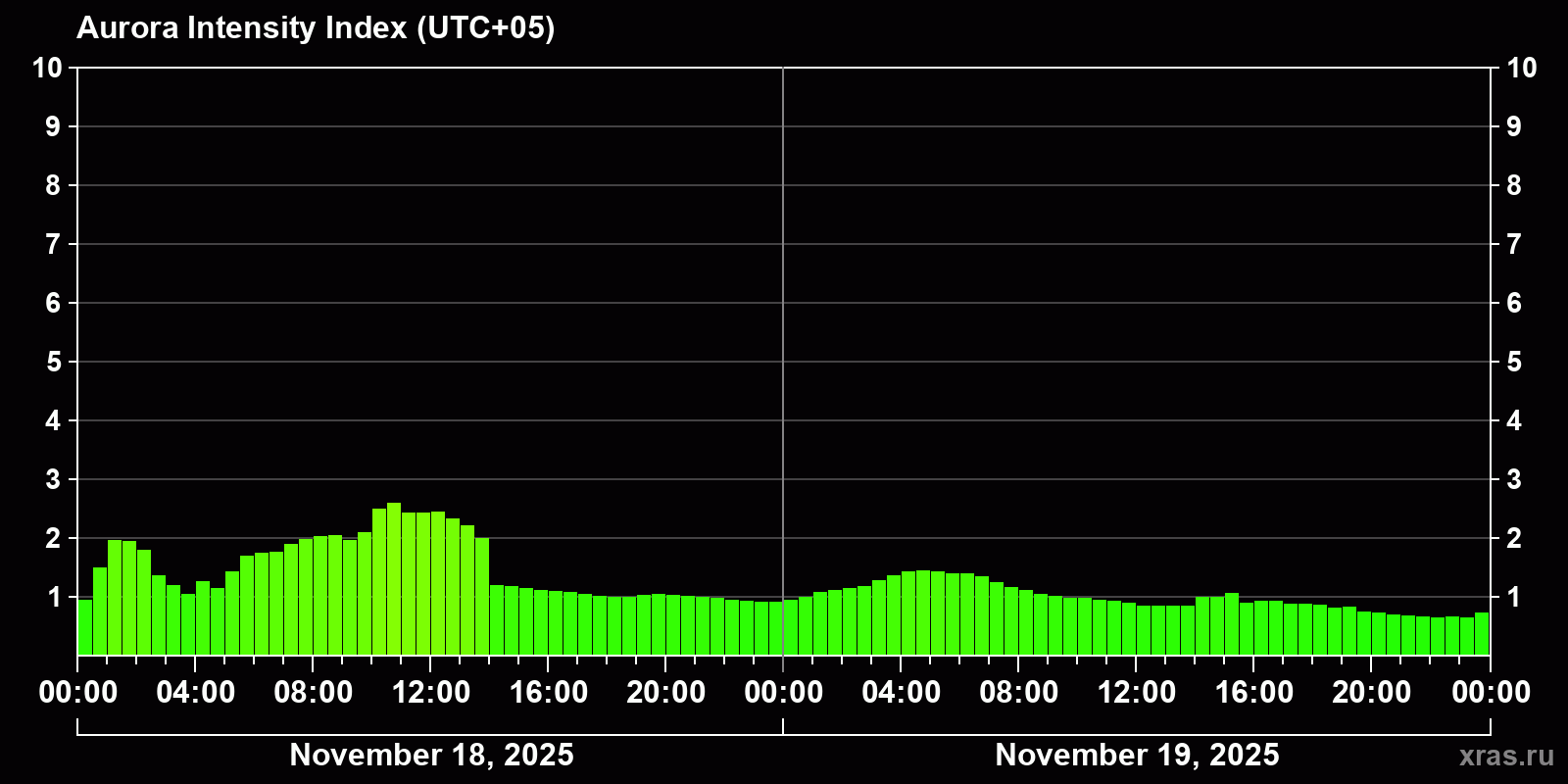 Auroral intensity index and the theoretically possible latitude of observations for nighttime in the Estern Hemisphere as of 2025-11-19 23:54 (end of day) local time
