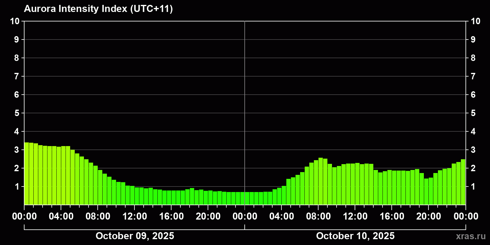 Changes in the auroral intensity index from 2025-10-09 to 2025-10-10 local time