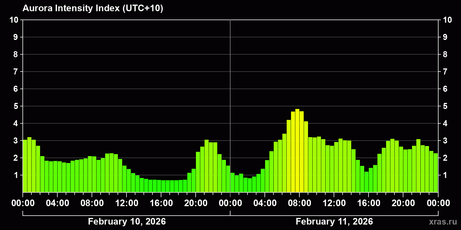 Changes in the auroral intensity index from 2026-02-10 to 2026-02-11 local time
