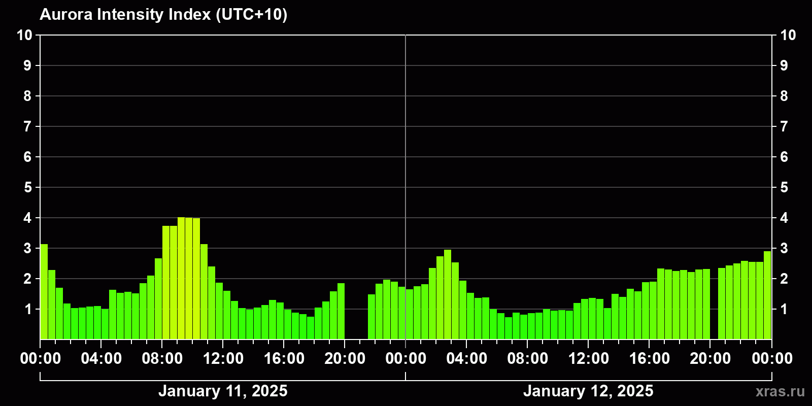 Changes in the auroral intensity index from 2025-01-11 to 2025-01-12 local time