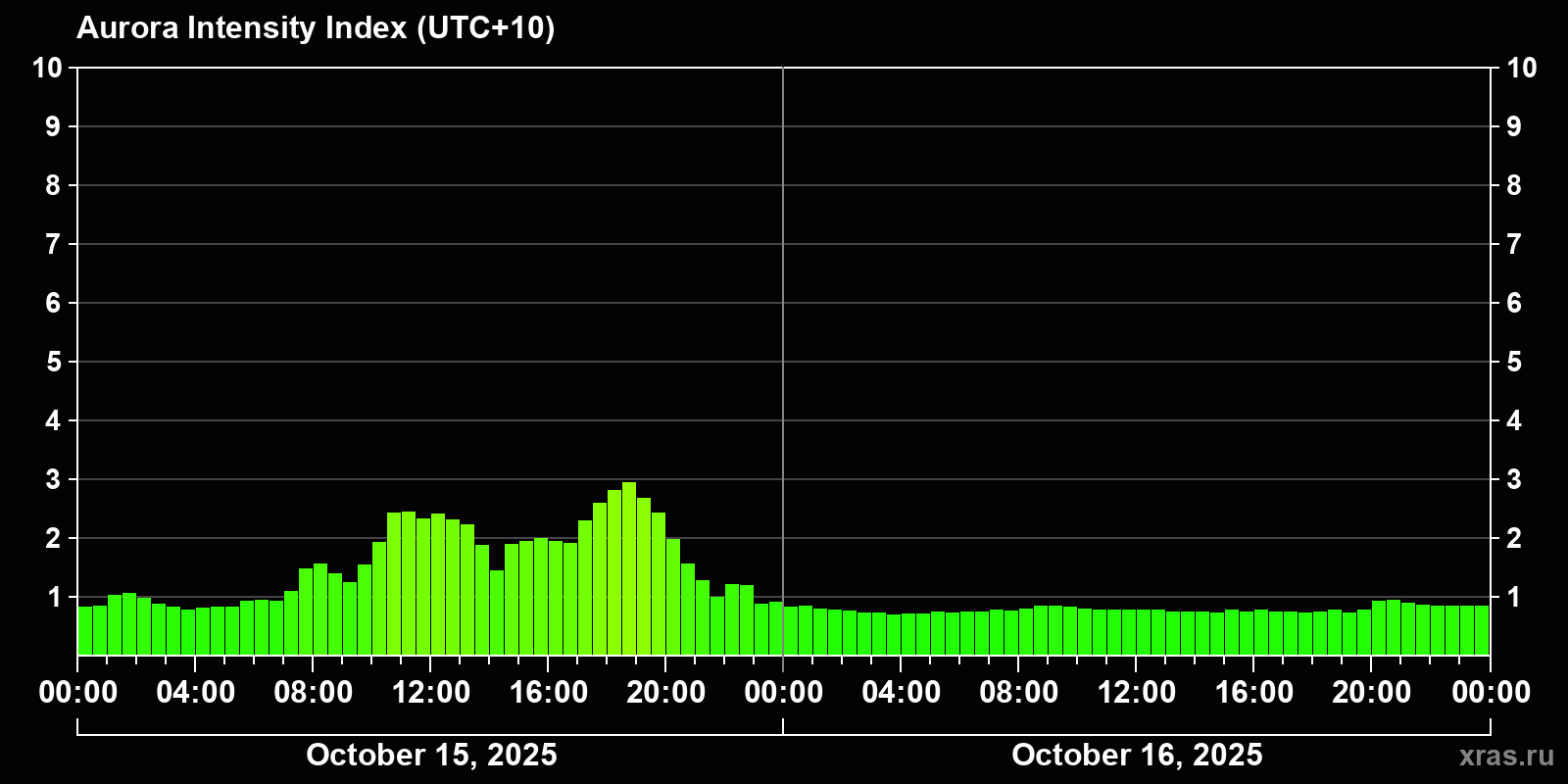 Auroral intensity index and the theoretically possible latitude of observations for nighttime in the Western Hemisphere as of 2025-10-17 00:55 (end of day) local time