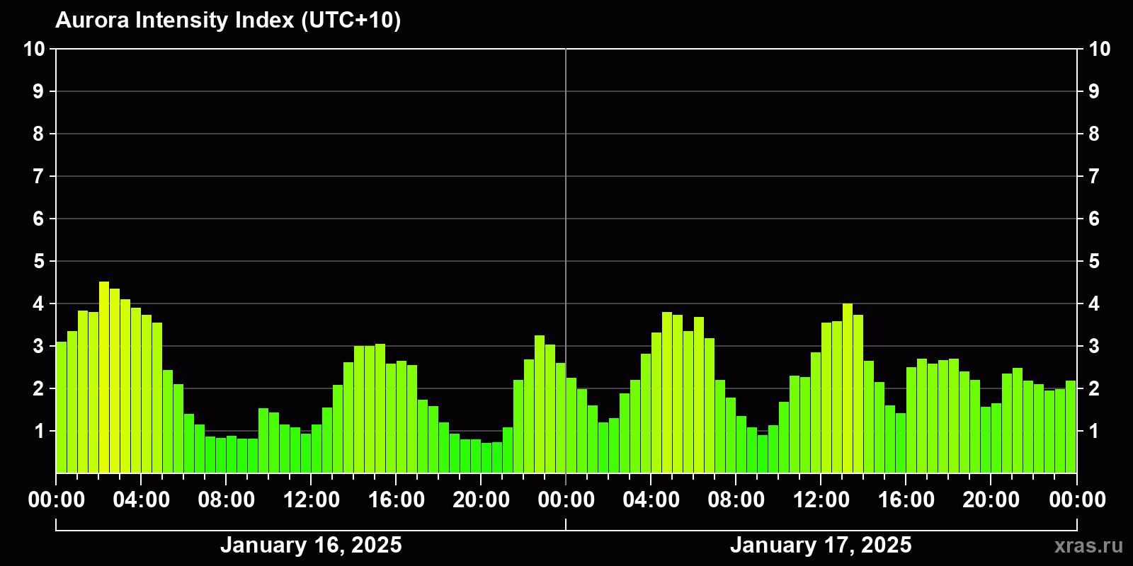 Changes in the auroral intensity index from 2025-01-16 to 2025-01-17 local time