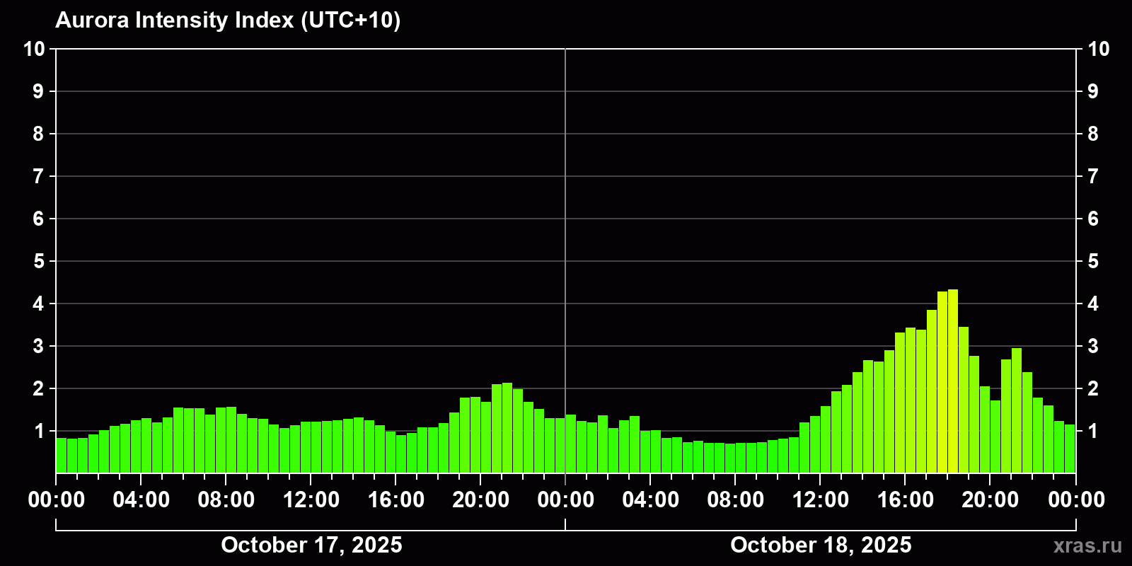 Changes in the auroral intensity index from 2025-10-18 to 2025-10-19 local time