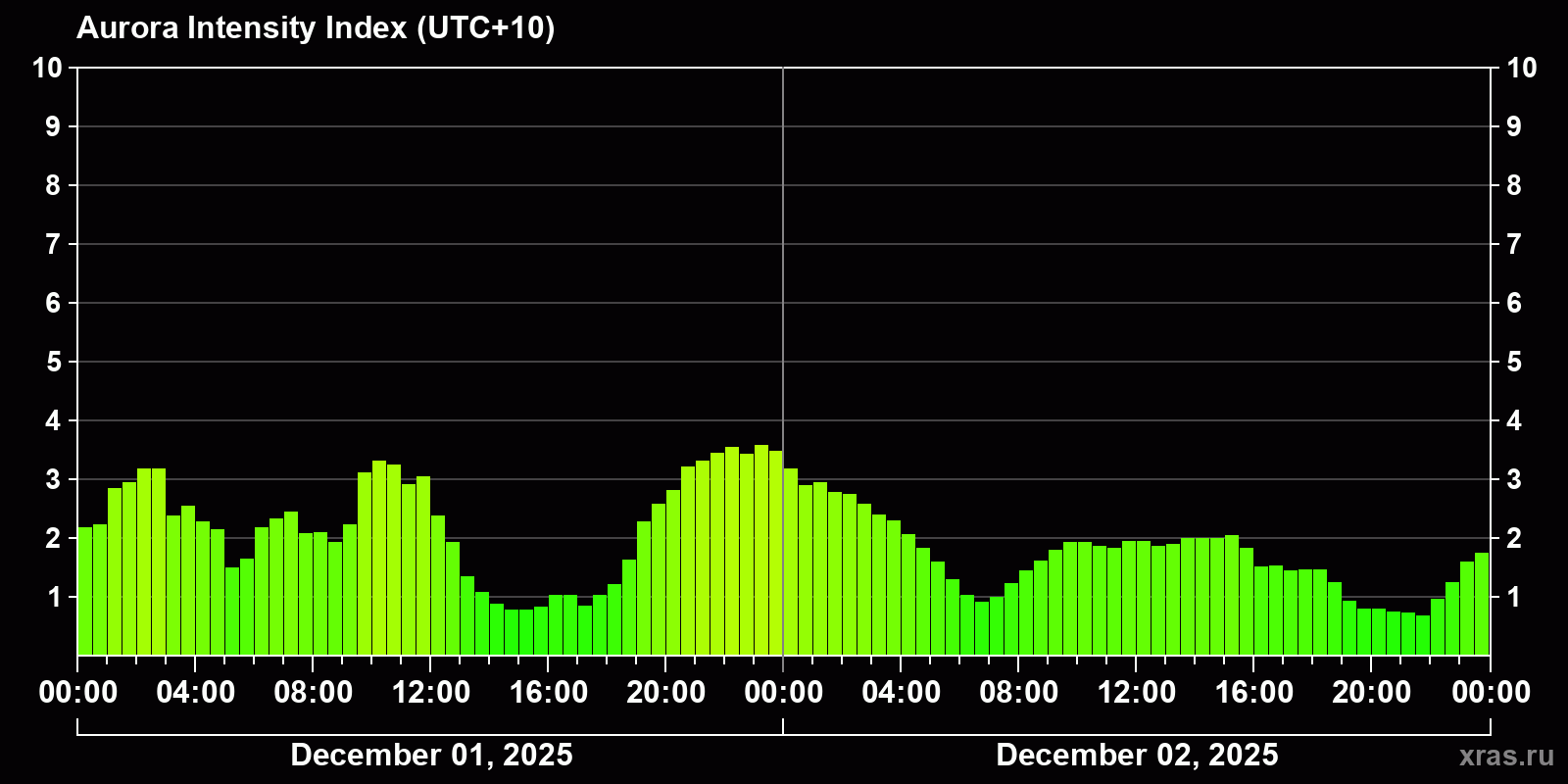 Changes in the auroral intensity index from 2025-12-01 to 2025-12-02 local time