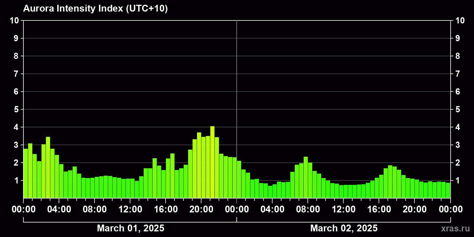 Changes in the auroral intensity index from 2025-03-01 to 2025-03-02 local time