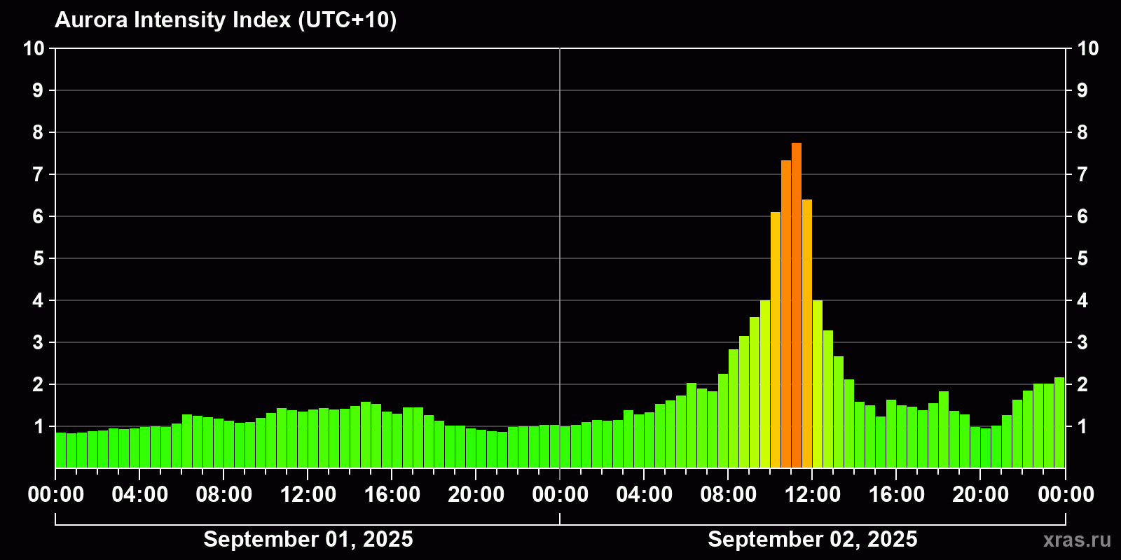 Changes in the auroral intensity index from 2025-09-02 to 2025-09-03 local time