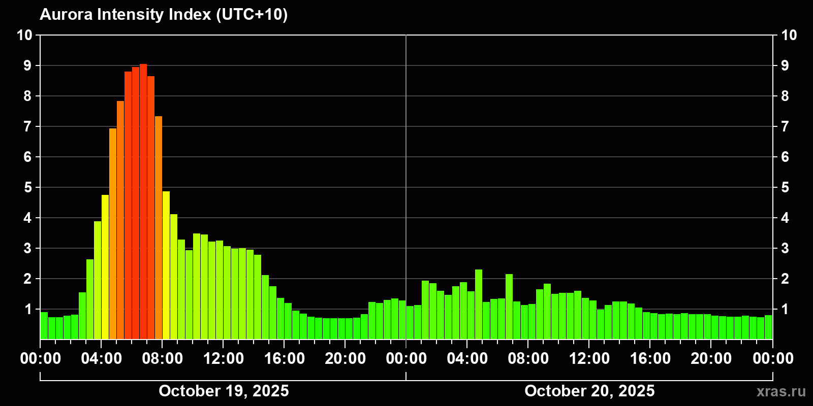 Changes in the auroral intensity index from 2025-10-20 to 2025-10-21 local time