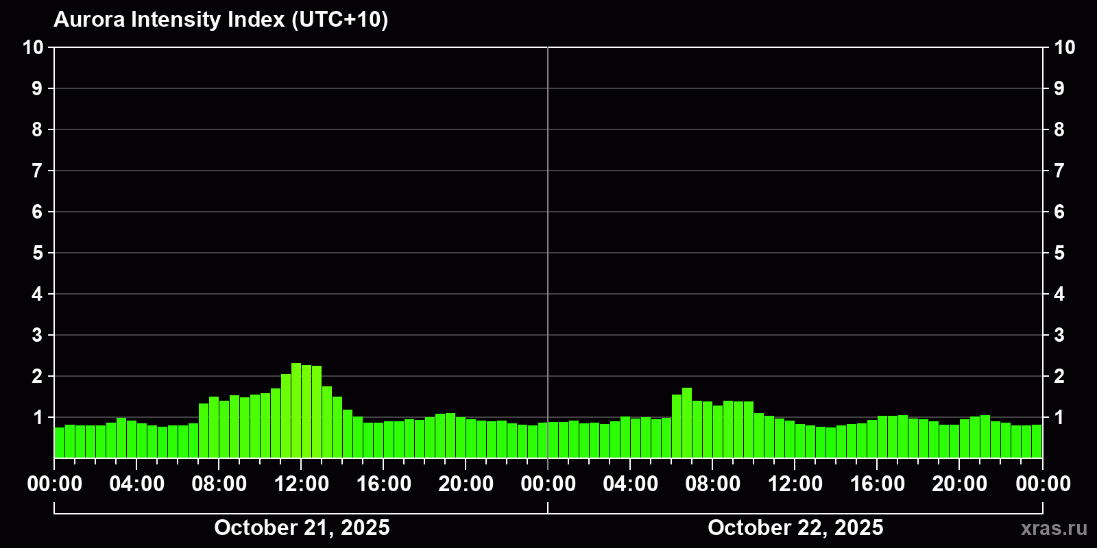 Changes in the auroral intensity index from 2025-10-22 to 2025-10-23 local time