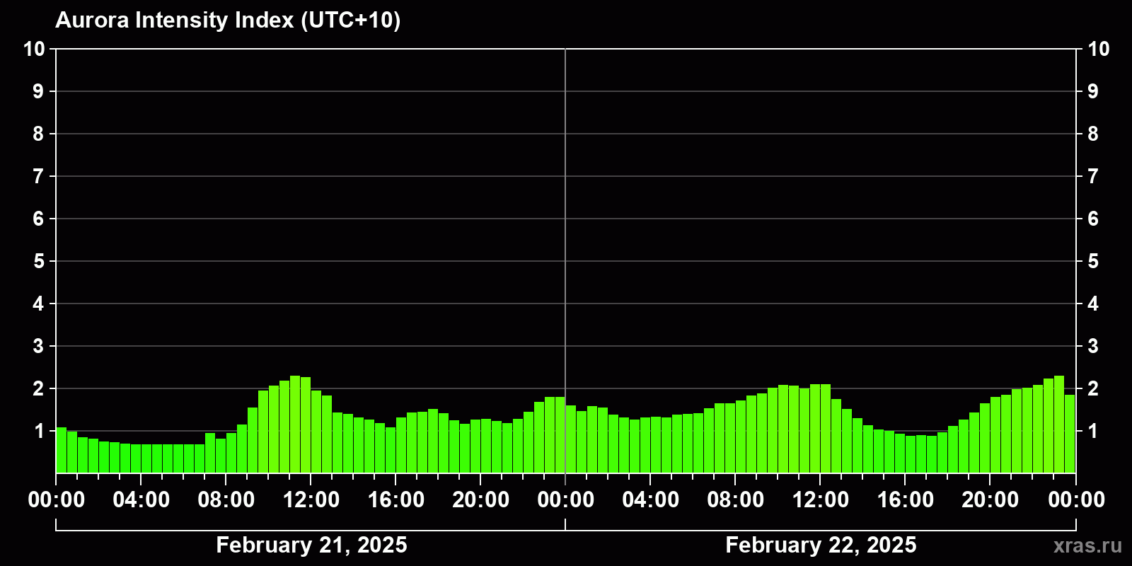Changes in the auroral intensity index from 2025-02-21 to 2025-02-22 local time