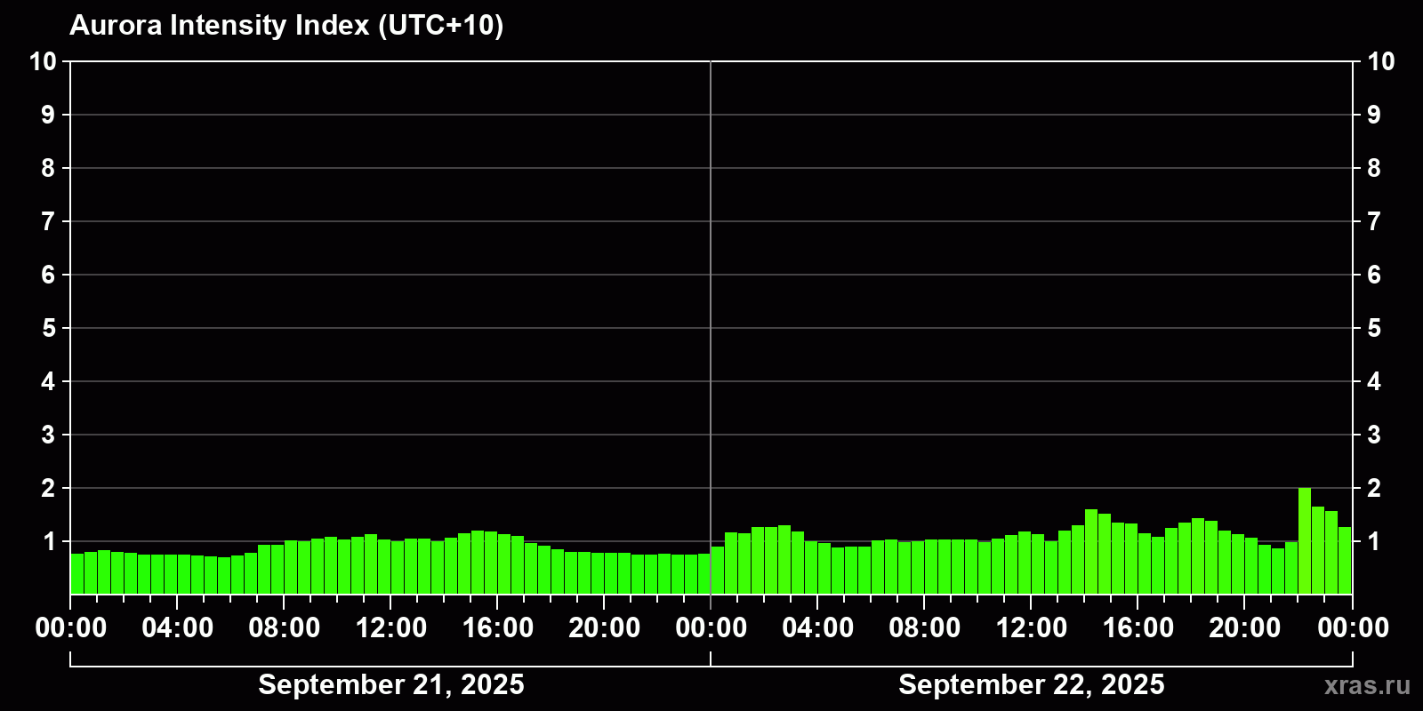 Changes in the auroral intensity index from 2025-09-22 to 2025-09-23 local time