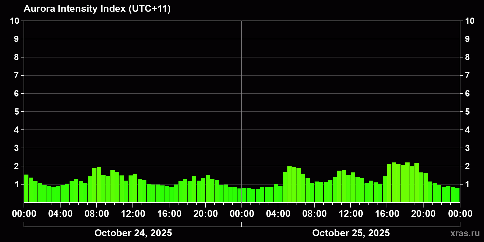 Changes in the auroral intensity index from 2025-10-24 to 2025-10-25 local time
