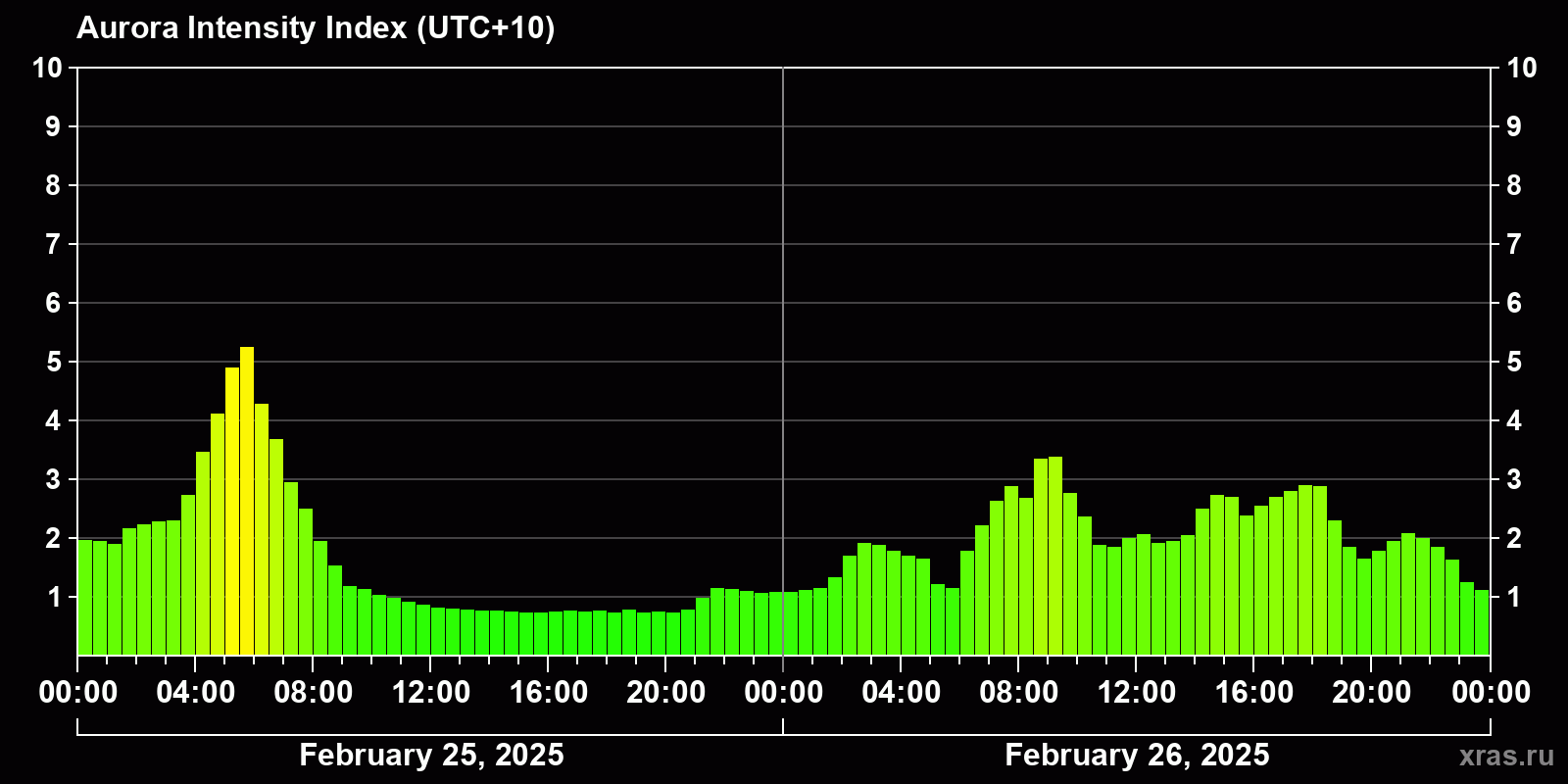 Changes in the auroral intensity index from 2025-02-25 to 2025-02-26 local time