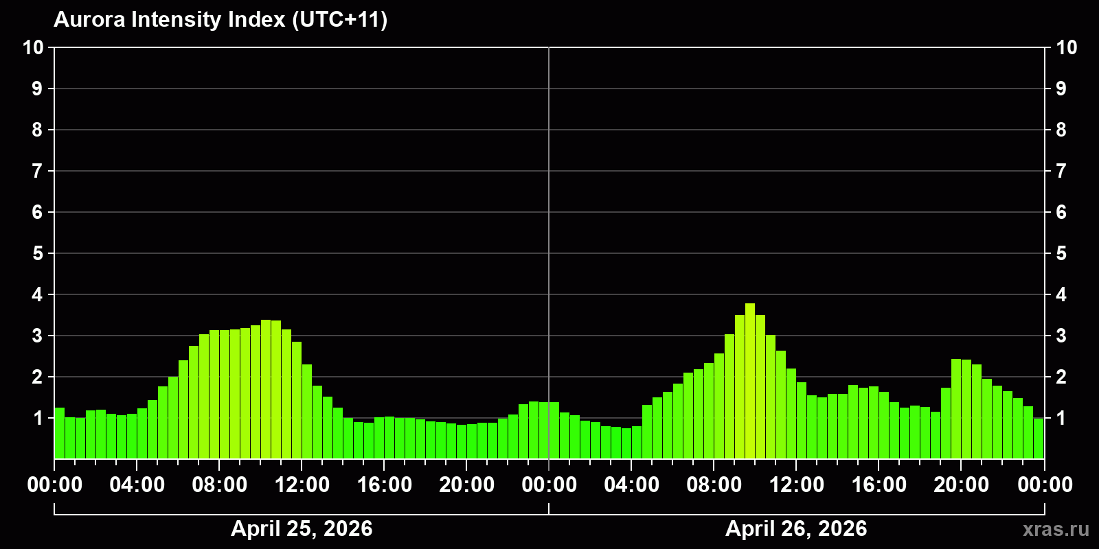 Changes in the auroral intensity index from 2026-04-25 to 2026-04-26 local time
