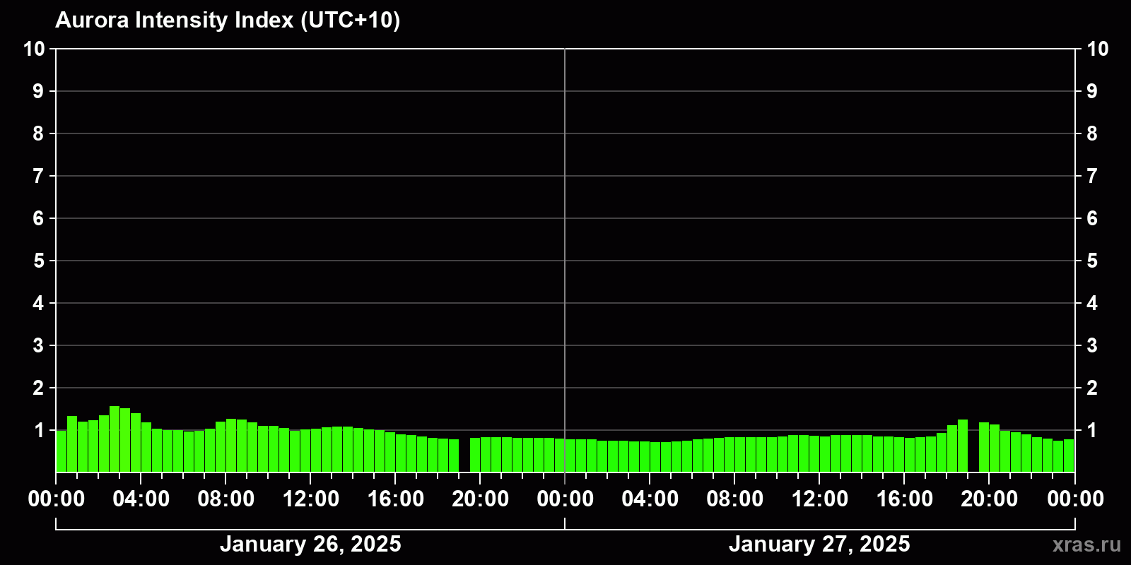 Changes in the auroral intensity index from 2025-01-26 to 2025-01-27 local time