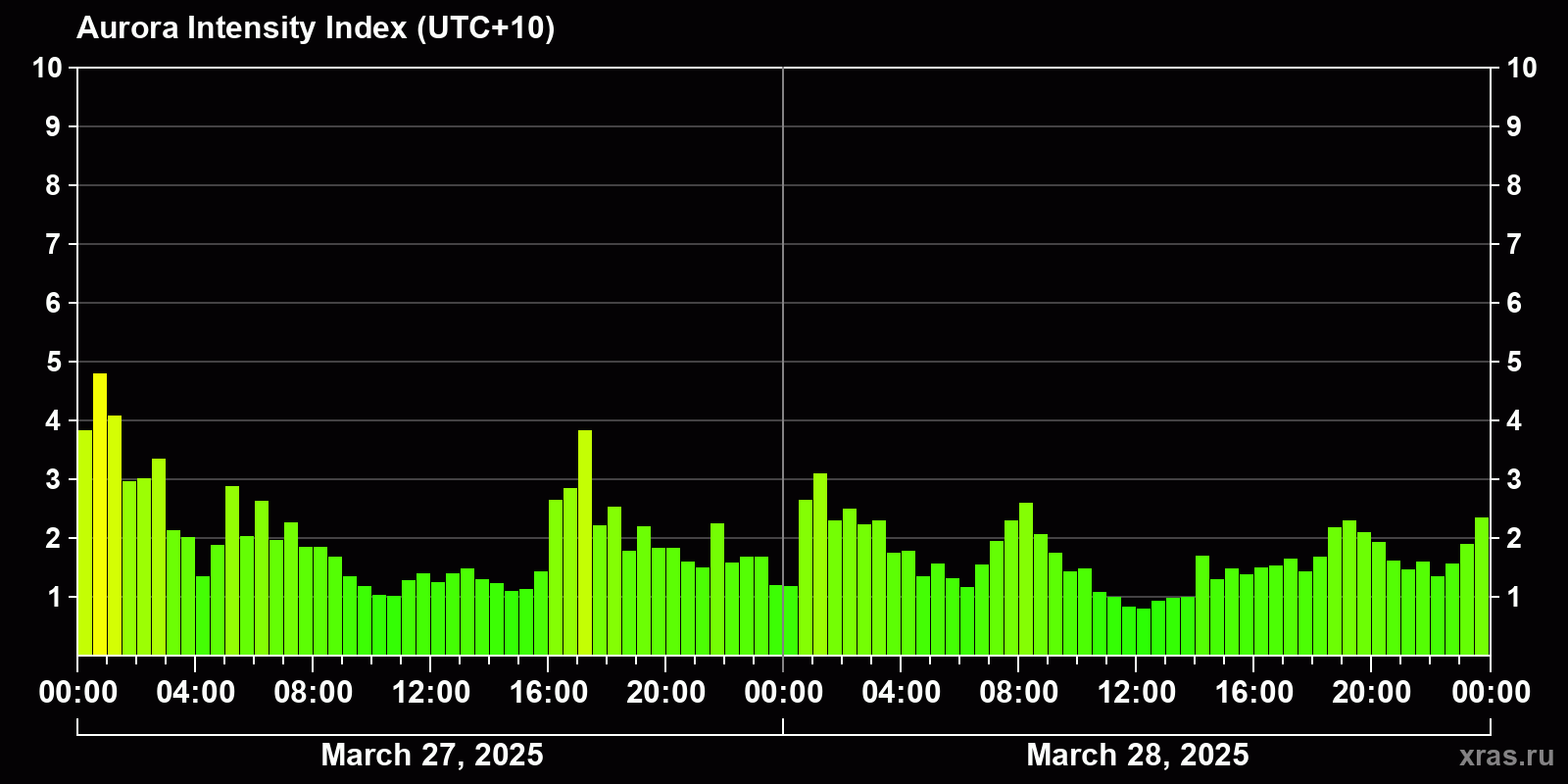 Changes in the auroral intensity index from 2025-03-27 to 2025-03-28 local time