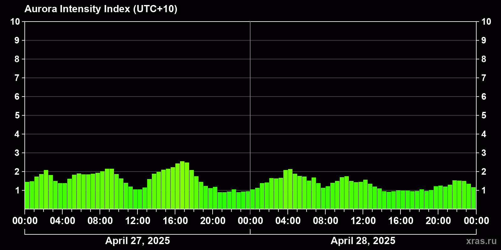 Changes in the auroral intensity index from 2025-04-28 to 2025-04-29 local time