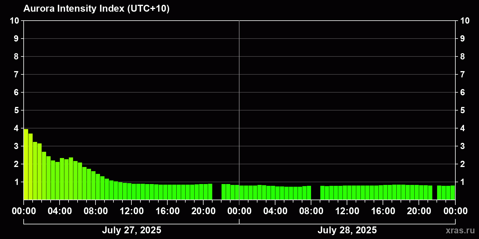 Changes in the auroral intensity index from 2025-07-28 to 2025-07-29 local time