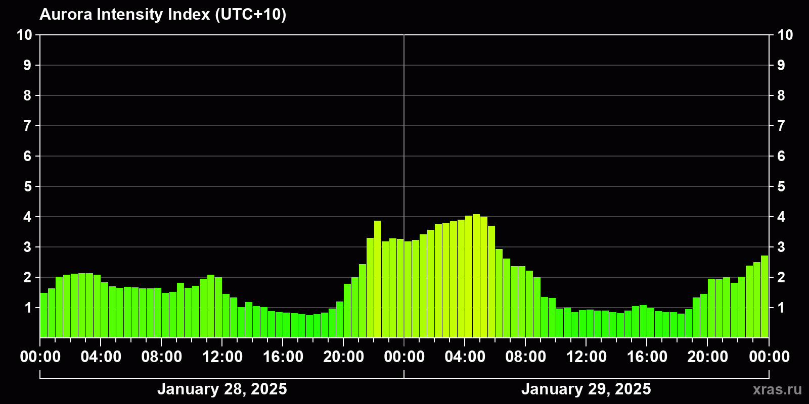 Changes in the auroral intensity index from 2025-01-28 to 2025-01-29 local time