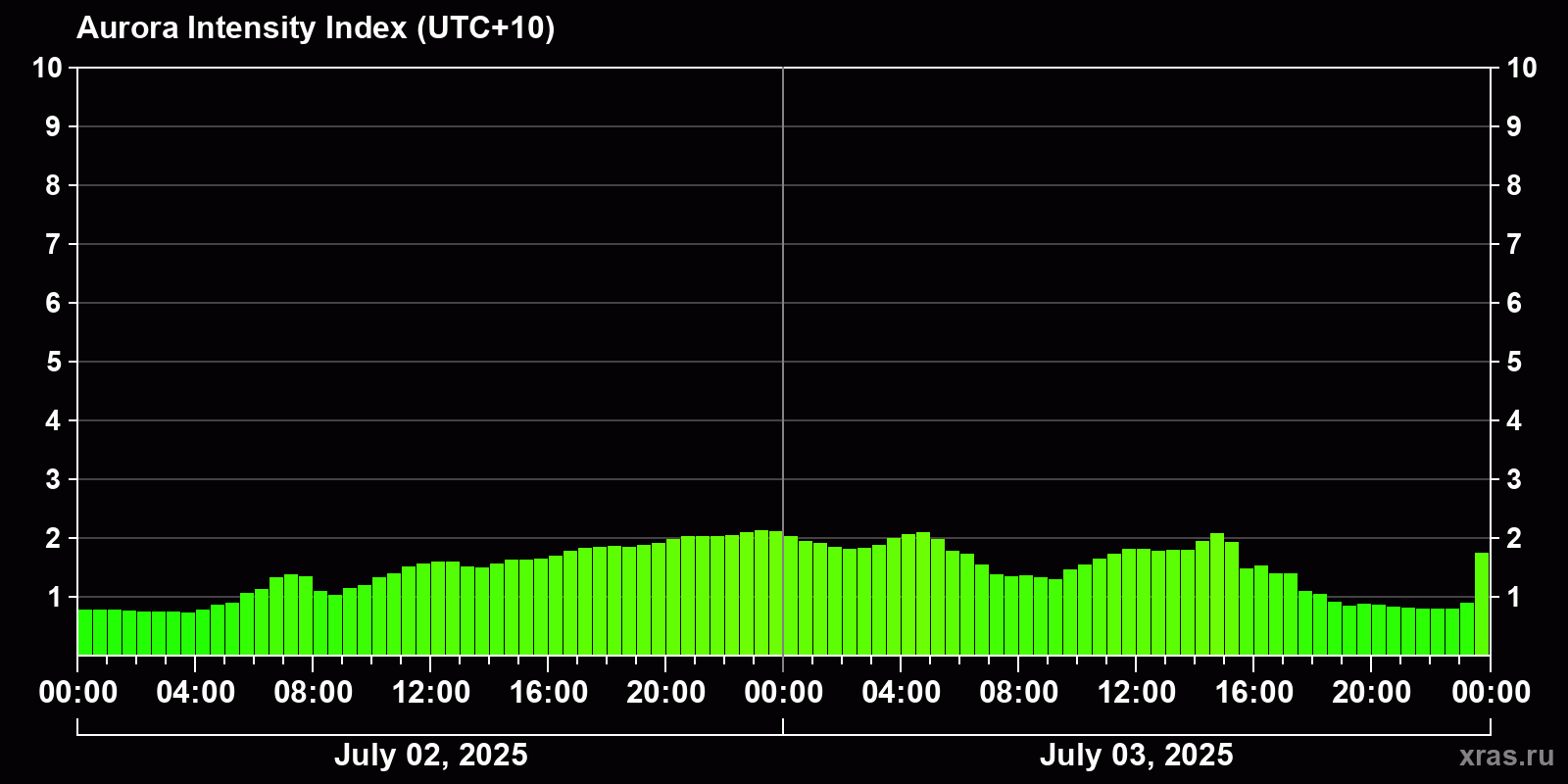 Changes in the auroral intensity index from 2025-07-02 to 2025-07-03 local time