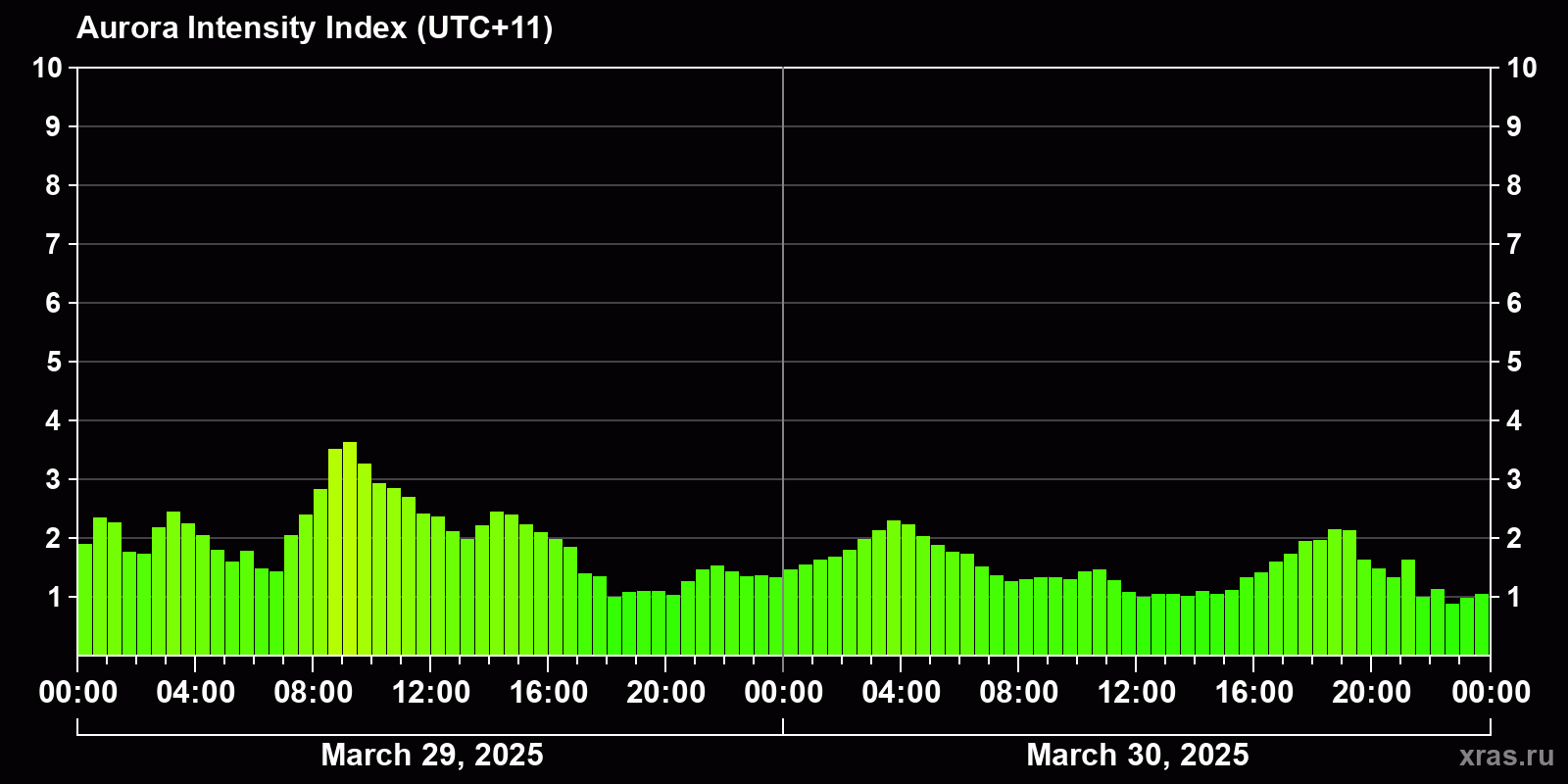 Changes in the auroral intensity index from 2025-03-30 to 2025-03-31 local time