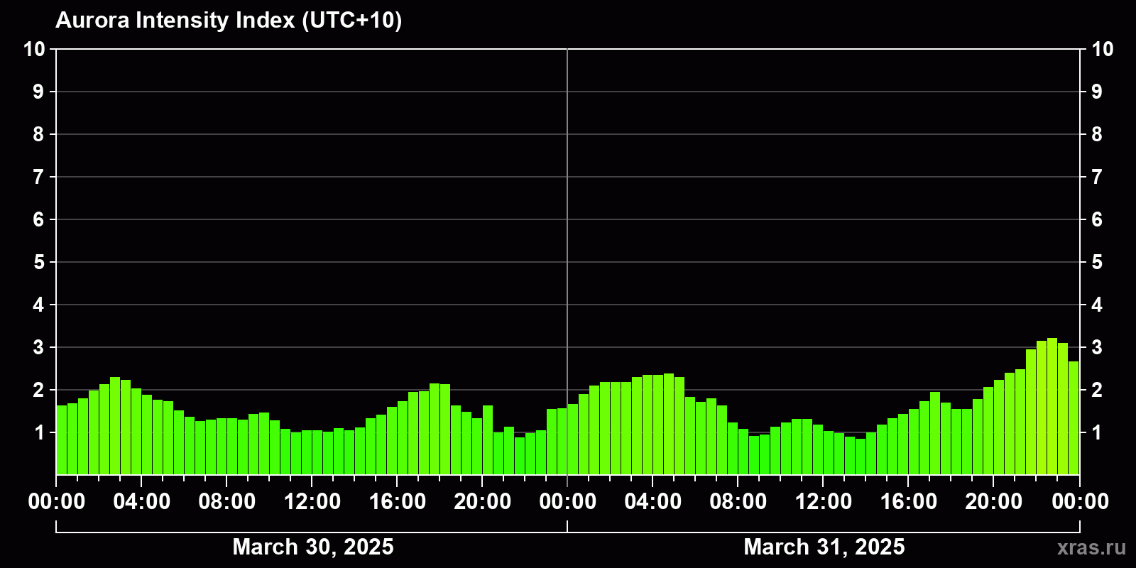 Changes in the auroral intensity index from 2025-03-31 to 2025-04-01 local time