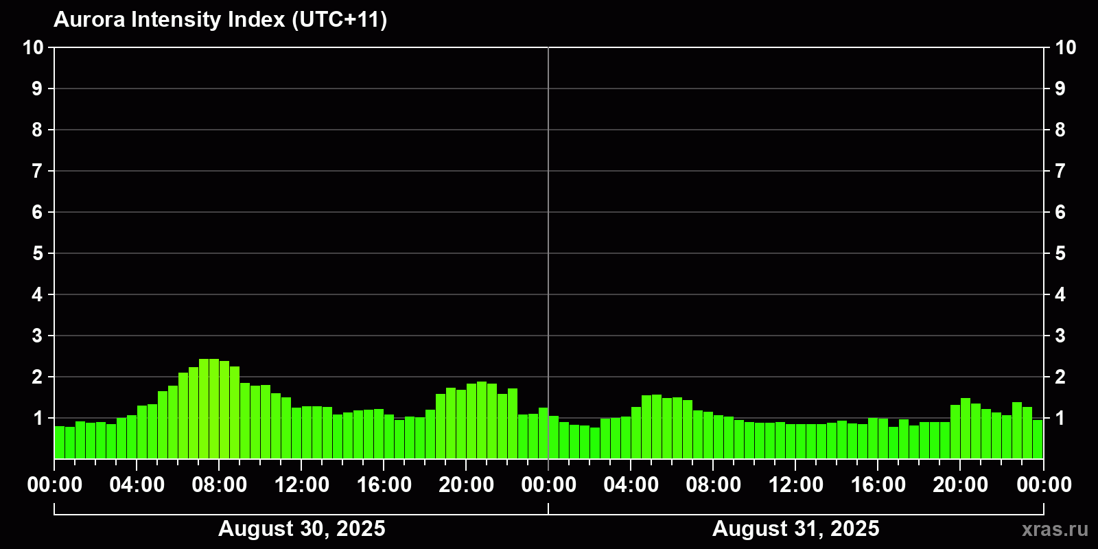 Changes in the auroral intensity index from 2025-08-30 to 2025-08-31 local time