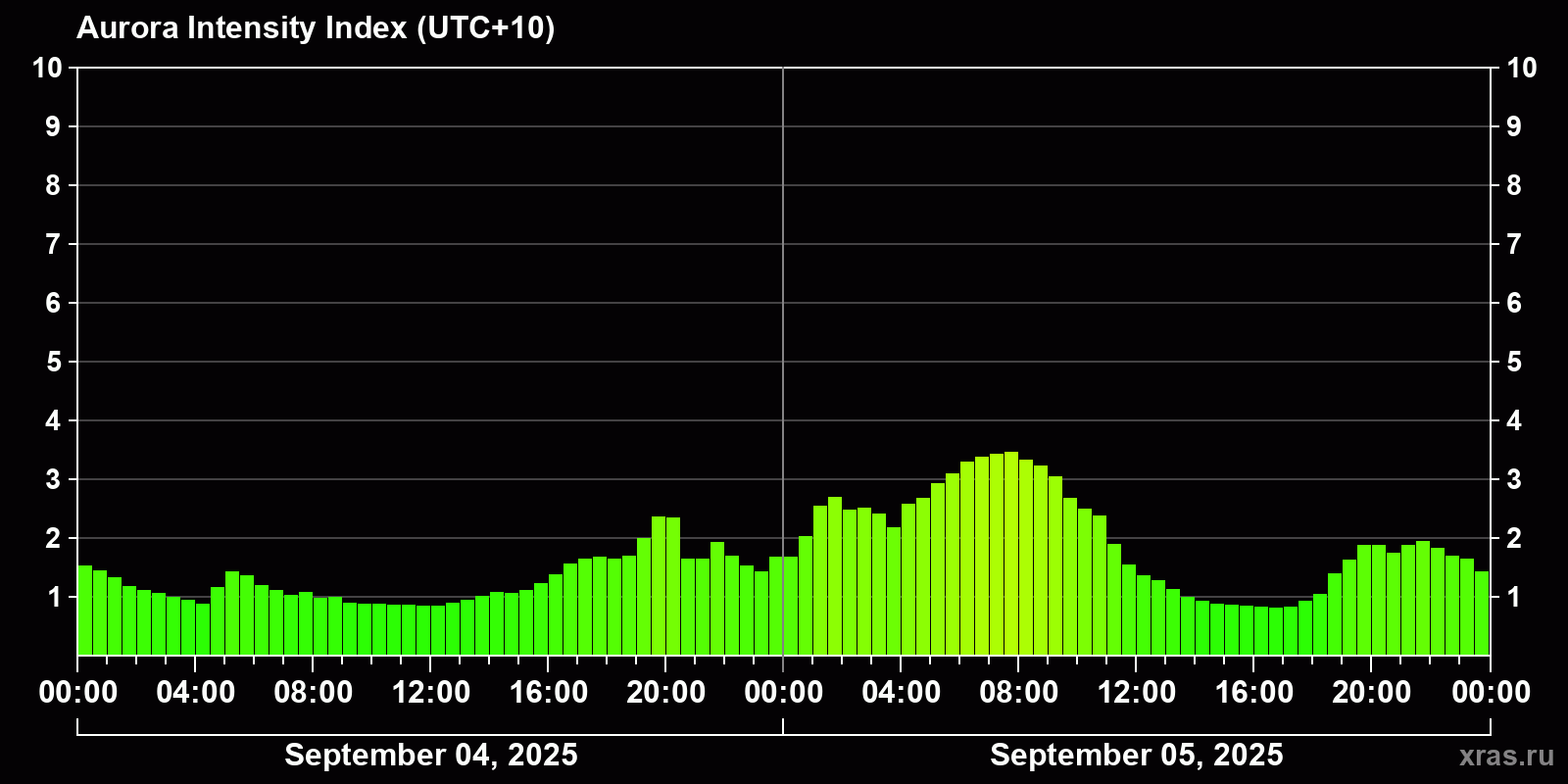 Changes in the auroral intensity index from 2025-09-05 to 2025-09-06 local time